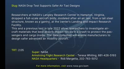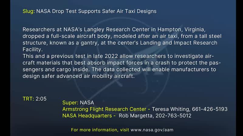 Researchers at NASA’s Langley Research Center in Hampton, Virginia, dropped a full-scale aircraft body, modeled after an air taxi, from a tall steel structure, known as a gantry, at the center’s Landing and Impact Research Facility. This and a previous test in late 2022 allow researchers to investigate aircraft materials that best absorb impact forces in a crash to protect the passengers and cargo inside. The data collected will enable manufacturers to design safer advanced air mobility aircraft.