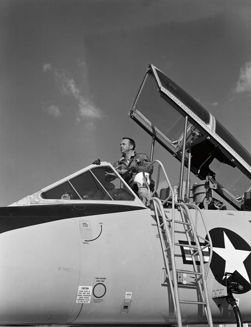 M61-00012 (20 Jan. 1961) --- Astronaut Alan B. Shepard Jr. pictured on the flight line climbing aboard a F-106 aircraft. Photo credit: NASA or National Aeronautics and Space Administration