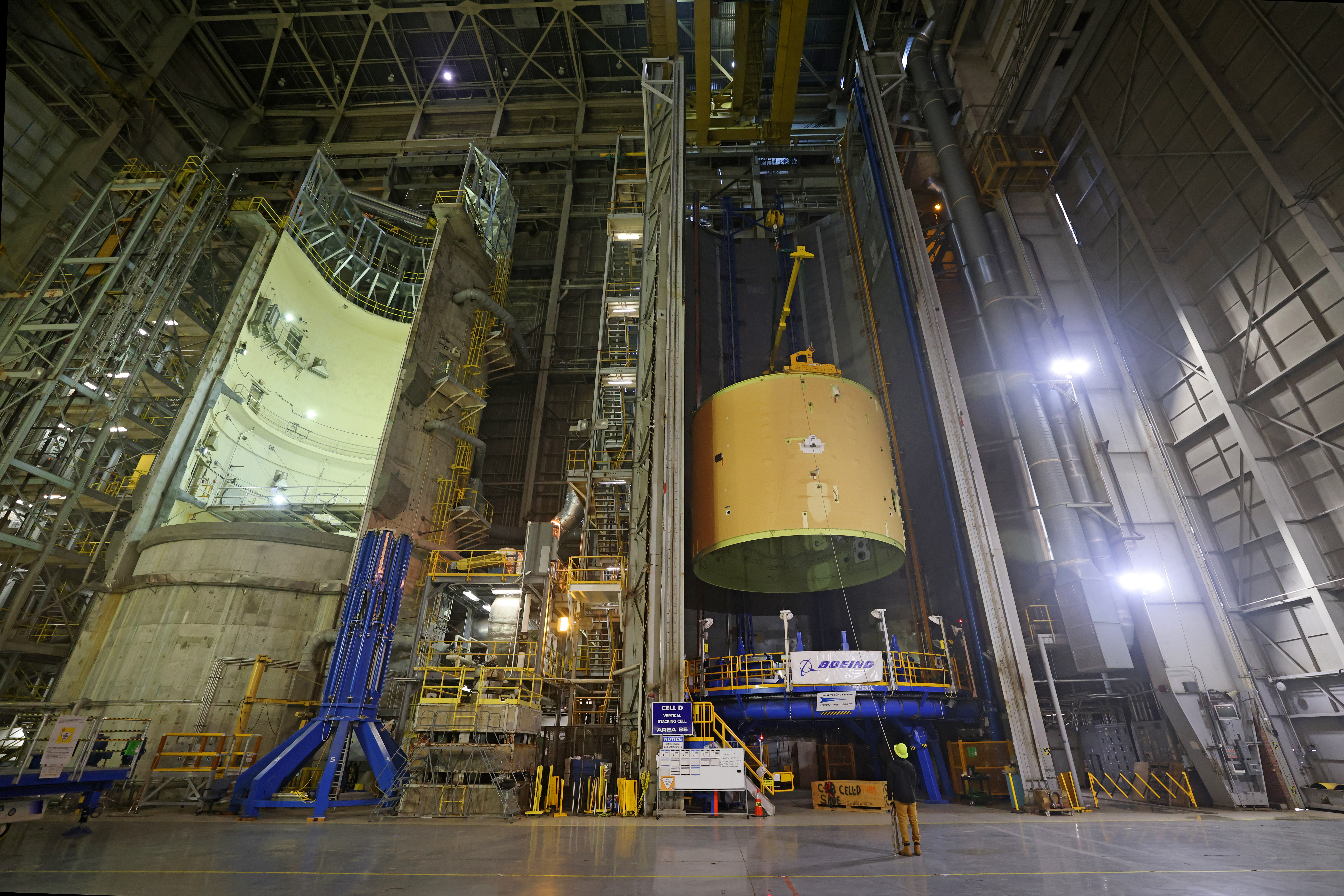 This image shows technicians and engineers beginning the process of the forward join on the core stage of NASA’s Space Launch System rocket for Artemis II, the first crewed mission of NASA’s Artemis program at NASA’s Michoud Assembly Facility. The forward join connects the forward skirt, the liquid oxygen tank (LOX) and the intertank structures to form the top part of the SLS rocket’s core stage. Now, NASA and Boeing, the SLS prime contractor, will continue to integrate various systems inside the forward part of the core stage and prepare for structural joining of the liquid hydrogen tank and engine section to form the bottom of the stage. Together with its four RS-25 engines, the rocket’s massive 212-foot-tall core stage — the largest stage NASA has ever built — and its twin solid rocket boosters will produce 8.8 million pounds of thrust to send NASA’s Orion spacecraft, astronauts and supplies beyond Earth’s orbit to the Moon and, ultimately, Mars. Offering more payload mass, volume capability and energy to speed missions through space, the SLS rocket, along with NASA’s Gateway in lunar orbit, the Human Landing System, and Orion spacecraft, is part of NASA’s backbone for deep space exploration and the Artemis lunar program. No other rocket is capable of carrying astronauts in Orion around the Moon in a single mission. Image credit: NASA/Michael DeMocker