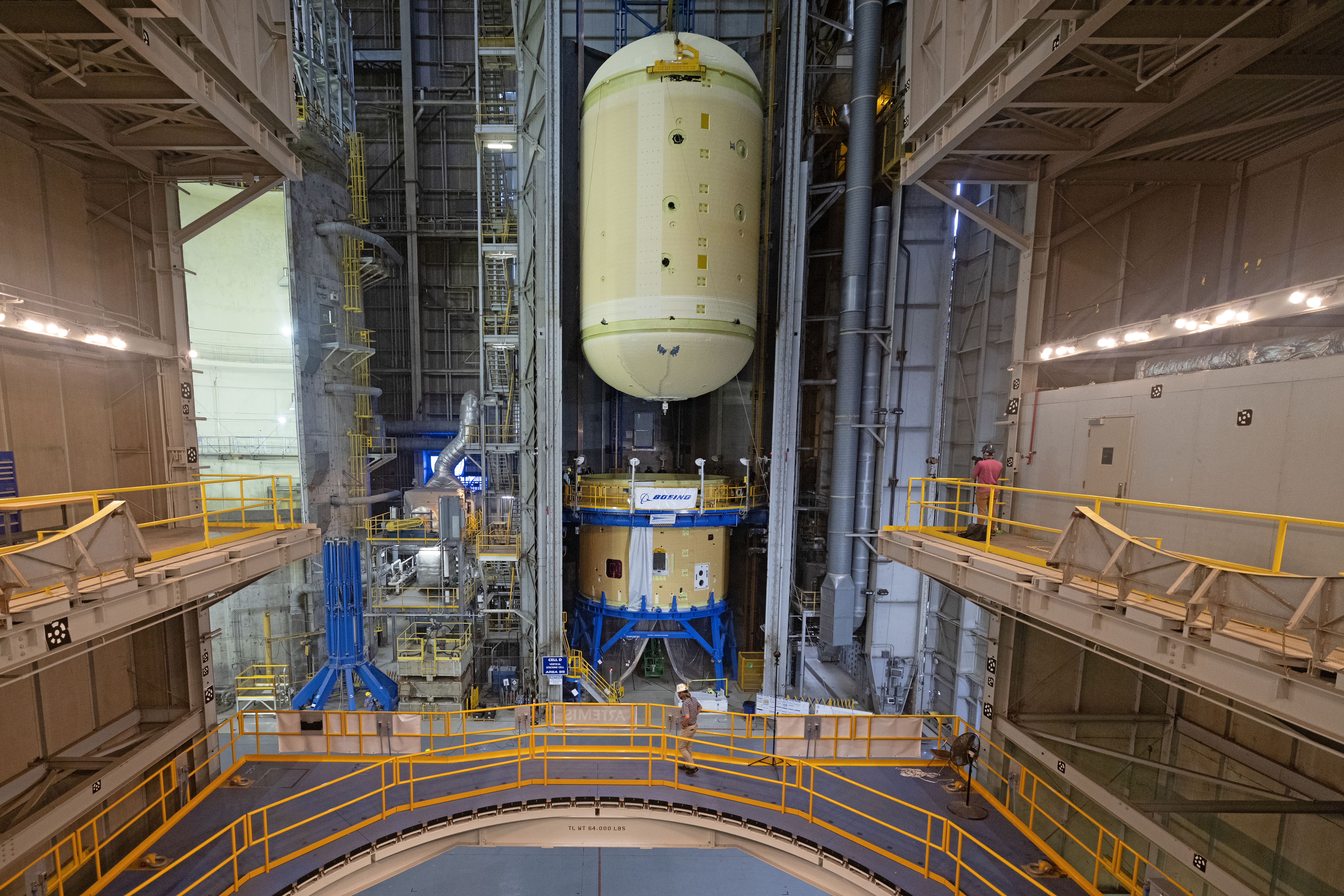 This image shows technicians and engineers move and connect the liquid oxygen tank (LOX) to the intertank as they continue the process of the forward join on the core stage of NASA’s Space Launch System rocket for Artemis II, the first crewed mission of NASA’s Artemis program at NASA’s Michoud Assembly Facility. The forward join connects the forward skirt, the liquid oxygen tank (LOX) and the intertank structures to form the top part of the SLS rocket’s core stage. Now, NASA and Boeing, the SLS prime contractor, will continue to integrate various systems inside the forward part of the core stage and prepare for structural joining of the liquid hydrogen tank and engine section to form the bottom of the stage. Together with its four RS-25 engines, the rocket’s massive 212-foot-tall core stage — the largest stage NASA has ever built — and its twin solid rocket boosters will produce 8.8 million pounds of thrust to send NASA’s Orion spacecraft, astronauts and supplies beyond Earth’s orbit to the Moon and, ultimately, Mars. Offering more payload mass, volume capability and energy to speed missions through space, the SLS rocket, along with NASA’s Gateway in lunar orbit, the Human Landing System, and Orion spacecraft, is part of NASA’s backbone for deep space exploration and the Artemis lunar program. No other rocket is capable of carrying astronauts in Orion around the Moon in a single mission. Image credit: NASA/Michael DeMocker