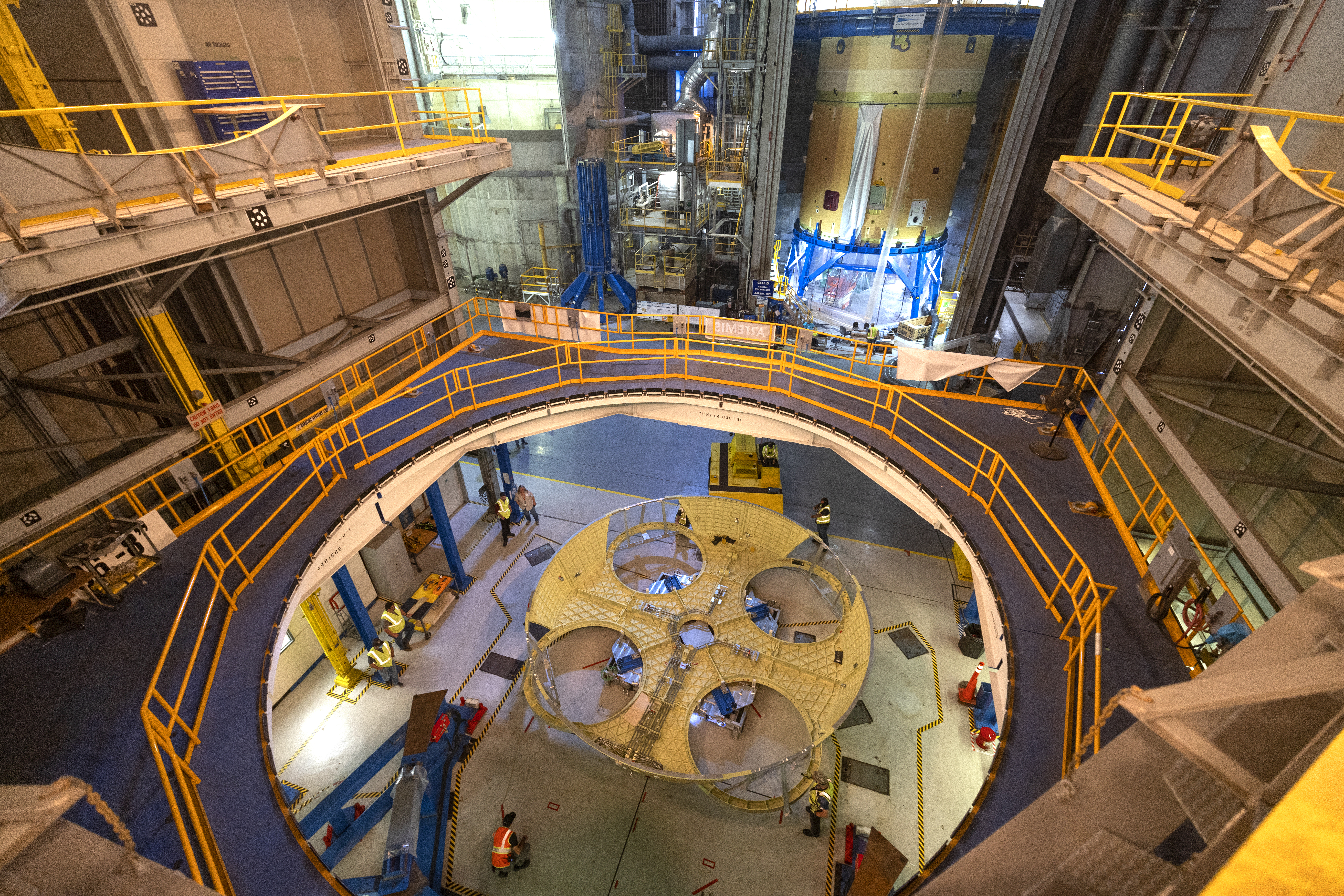 Technicians and engineers move the boat-tail structure for the core stage of NASA’s Space Launch System’s (SLS) rocket for Artemis II, the first crewed mission of NASA’s Artemis program at NASA’s Michoud Assembly Facility. The boat-tail, a fairing-like cover that attaches to the engine section on the bottom of the core stage, protects and covers most of the four RS-25 engines’ critical systems. Together with its four RS-25 engines, the rocket’s massive 212-foot-tall core stage — the largest stage NASA has ever built — and its twin solid rocket boosters will produce 8.8 million pounds of thrust to send NASA’s Orion spacecraft, astronauts and supplies beyond Earth’s orbit to the Moon and, ultimately, Mars. Offering more payload mass, volume capability and energy to speed missions through space, the SLS rocket, along with NASA’s Gateway in lunar orbit, the Human Landing System, and Orion spacecraft, is part of NASA’s backbone for deep space exploration and the Artemis lunar program. No other rocket is capable of carrying astronauts in Orion around the Moon in a single mission. Photographed on Wednesday, June 9, 2021. Image credit: NASA/Michael DeMocker
