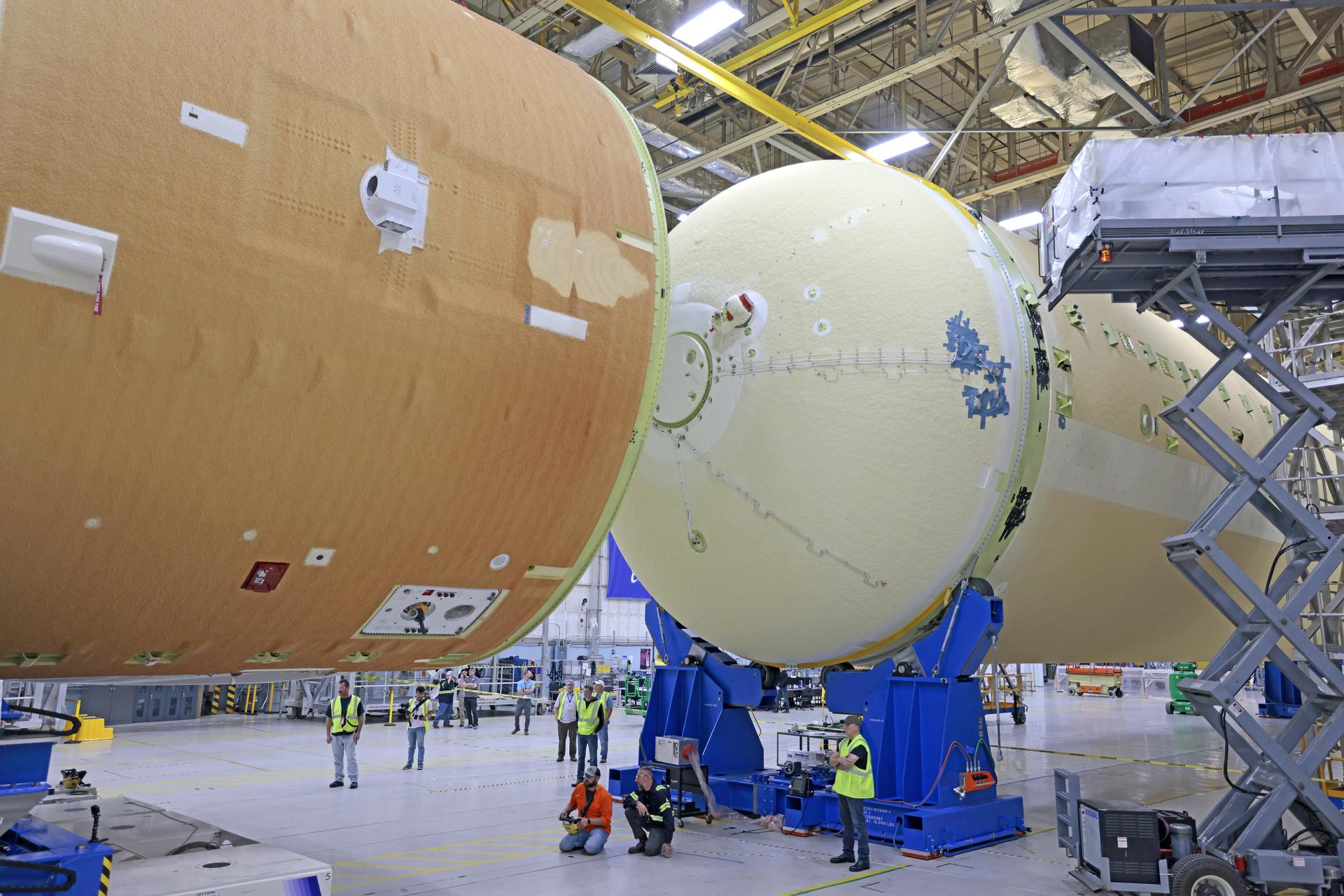 NASA is preparing major pieces of the Space Launch System rocket’s core stage to be joined as part of assembling the core stage for the Artemis II mission that will send crews to lunar orbit. Crews will soon connect the forward assembly with the 130-foot liquid hydrogen tank in the final assembly area at NASA’s Michoud Assembly Facility in New Orleans. When this process is completed, four of the five large structures that make up the core stage will be joined. The 66-foot forward assembly consists of the forward skirt, liquid oxygen tank and the intertank, which were mated earlier. This forward assembly will be joined with the 130-foot liquid hydrogen tank, the largest part of the stage that holds more than 500,000 gallons of cryogenic propellant. To compete the Artemis II core stage, engineers will add the engine section, which is currently being outfitted and includes the main propulsion systems that connect to the four RS-25 engines, Together, with the SLS twin solid rocket boosters, the core stage will produce 8.8 million pounds of thrust to send NASA’s Orion spacecraft, astronauts, and supplies beyond Earth’s orbit to the Moon. The SLS rocket and the Orion spacecraft form the foundation for deep space exploration and the Artemis lunar program. For more on the core stage: https://www.nasa.gov/exploration/systems/sls/multimedia/infographics/corestage101.html Image credit: NASA/Michael DeMocker
