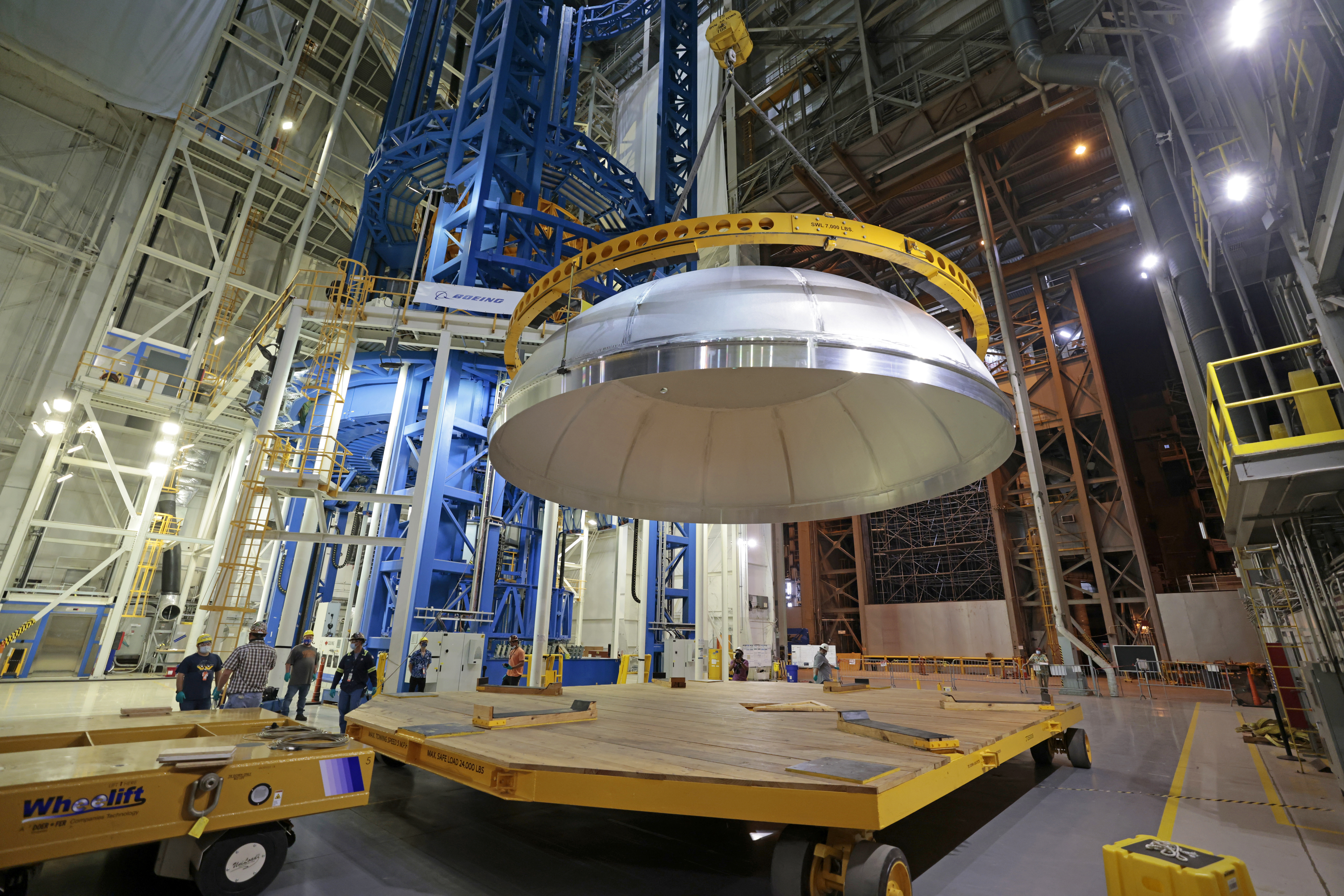Teams completed the welding of the Artemis III core stage liquid oxygen tank dome at the NASA’s Michoud Assembly Facility in New Orleans. Crews moved the dome, which is the top of the tank. The dome was moved to an assembly area where it will be loaded into a robotic welder that will join it with the forward barrel to create half of the liquid oxygen tank. Later another barrel and dome will be added to complete the entire tank. The Space Launch System (SLS) core stage liquid oxygen tank holds 196,000 gallons of super-cooled liquid propellant that serves as one of the propellants for the four RS-25 engines. The SLS core stage is made up of five unique elements: the forward skirt, liquid oxygen tank, intertank, liquid hydrogen tank, and the engine section. The liquid oxygen and the liquid hydrogen tank will provide propellant to the four RS-25 engines to produce more than two million pounds of thrust to help launch NASA’s Orion spacecraft, astronauts, and supplies beyond Earth’s orbit to the Moon. Image credit: NASA/Michael DeMocker