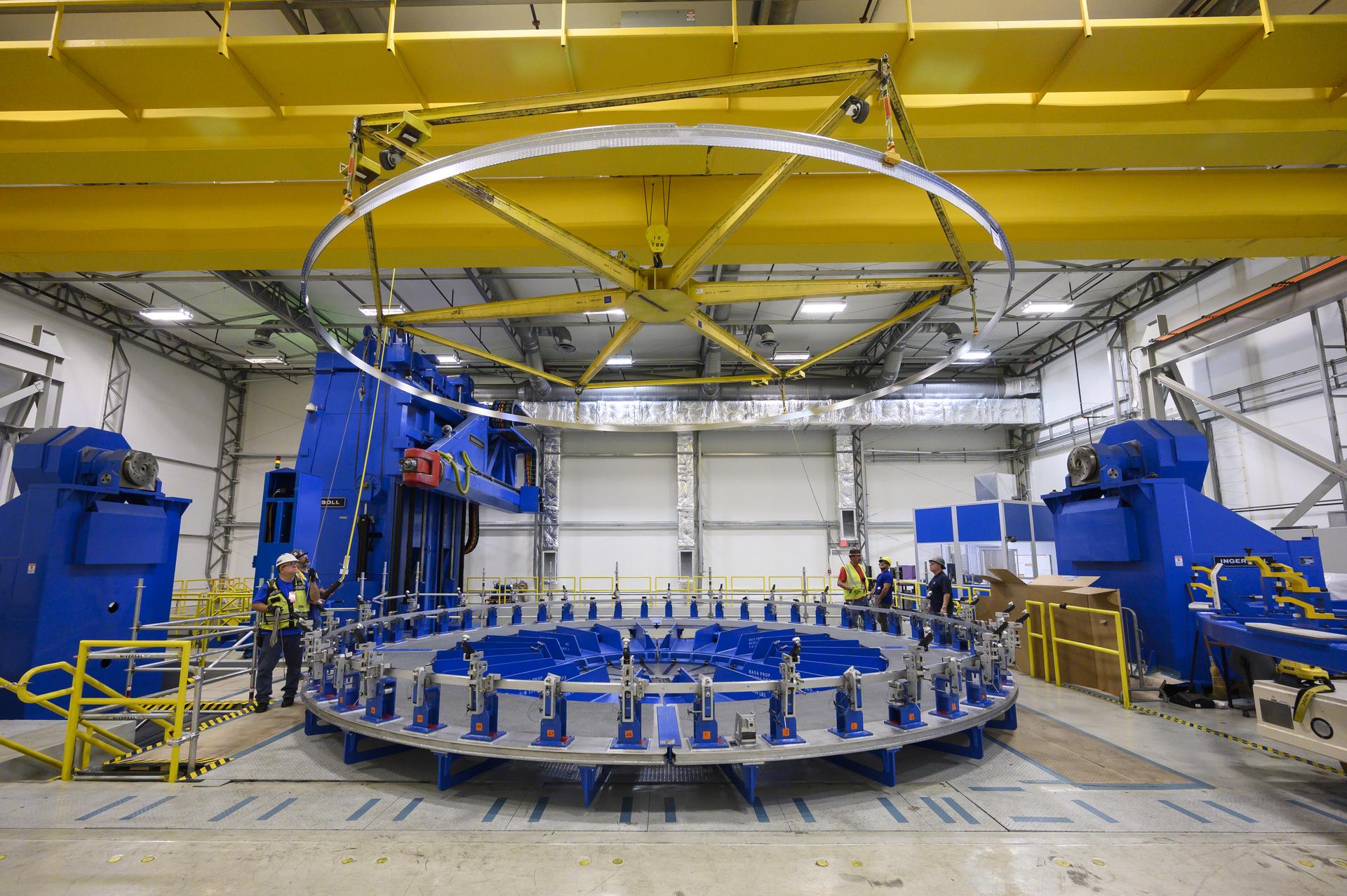 Technicians at NASA’s Michoud Assembly Facility in New Orleans lift a ring for the Exploration Upper Stage (EUS) of the SLS (Space Launch System) rocket to move it to another location in the 43-acre factory for further inspection and production. Flight hardware of the SLS EUS, a more powerful in-space propulsion stage beginning with Artemis IV, is in early production at Michoud. The rings make up the barrel sections for the flight hardware. The Exploration Upper Stage will be used on the second configuration of the SLS rocket, known as Block 1B, and will provide in-space propulsion to send astronauts in NASA’s Orion spacecraft and heavy cargo on a precise trajectory to the Moon. EUS will replace the interim cryogenic propulsion stage for the Block 1 configuration of SLS. It has larger propellant tanks and four RL10 engines, enabling SLS to launch 40% more cargo to the Moon along with crew. NASA and Boeing, the SLS lead contractor for the core stage and EUS, are currently manufacturing stages for Artemis II, III, IV, and V at the factory. NASA is working to land the first woman and first person of color on the Moon under Artemis. SLS is part of NASA’s backbone for deep space exploration, along with Orion and the Gateway in orbit around the Moon. SLS is the only rocket that can send Orion, astronauts, and supplies to the Moon in a single mission.
