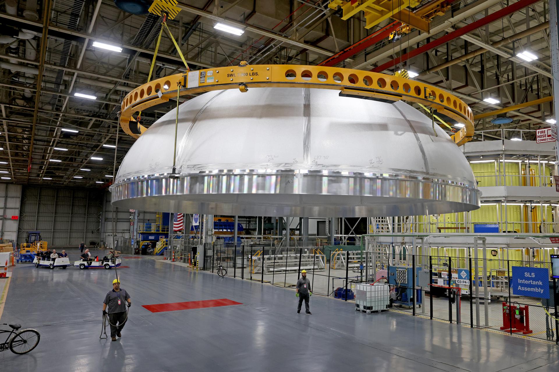 Teams completed welding of the liquid oxygen dome for the core stage of a future SLS (Space Launch System) rocket at NASA’s Michoud Assembly Facility in New Orleans. The dome, which will cap off the forward end of the liquid oxygen tank, was lifted off of the robotic weld tool and moved to an assembly area for the next phase of production. Later, crews will add the forward dome to join the two barrels and the aft dome to complete the liquid oxygen tank. The flight hardware will be used for Artemis IV, the first flight of SLS in its Block 1B configuration. The SLS core stage liquid oxygen tank holds 196,000 gallons of super-cooled liquid propellant. The SLS core stage is made up of five unique elements: the forward skirt, liquid oxygen tank, intertank, liquid hydrogen tank, and the engine section. The liquid oxygen and the liquid hydrogen tanks will provide propellant to the four RS-25 engines to produce more than two million pounds of thrust to help launch NASA’s Orion spacecraft, astronauts, and supplies beyond Earth’s orbit to the Moon. Image credit: NASA/Michael DeMocker