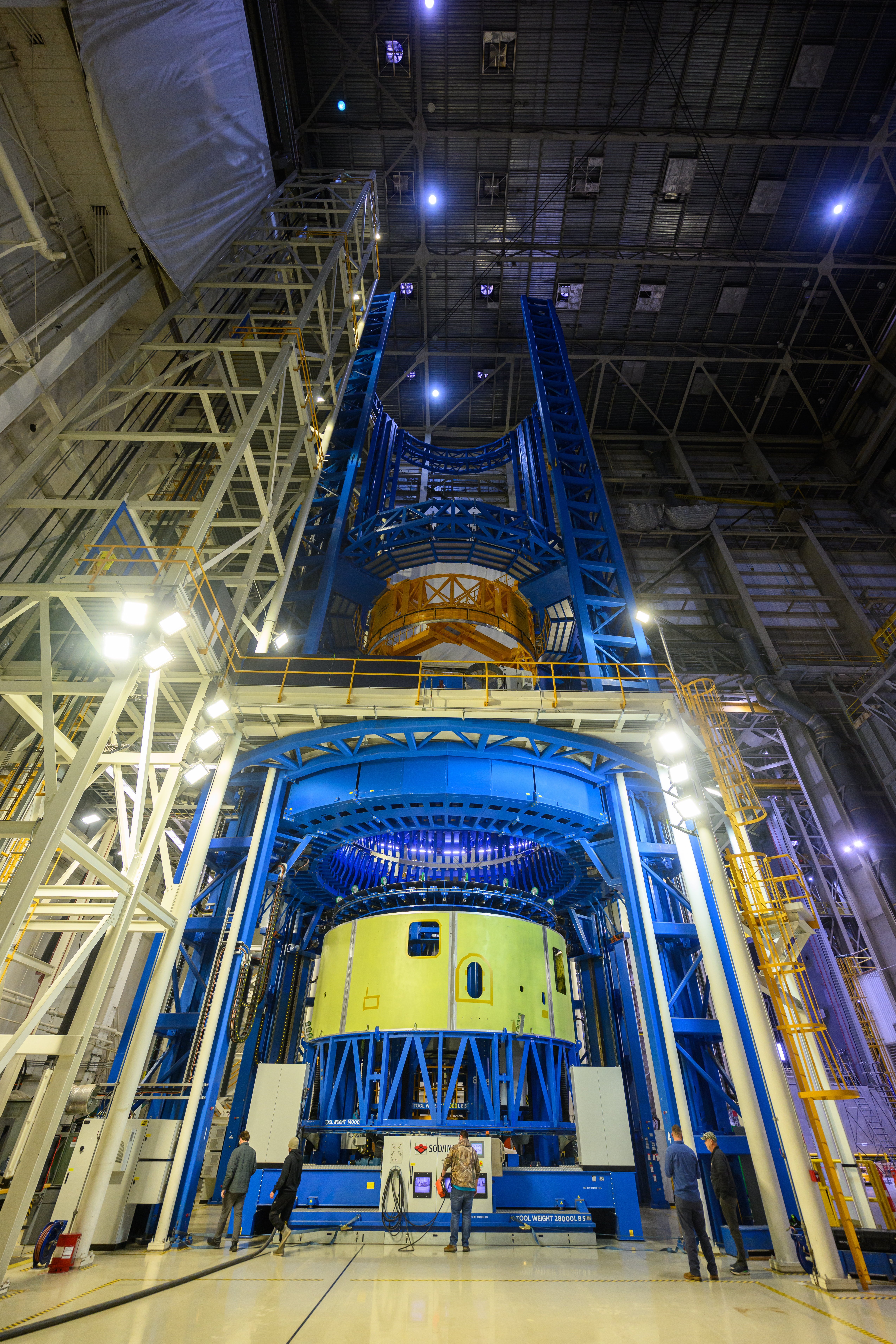 Teams at NASA’s Michoud Assembly Facility in New Orleans move the forward skirt, which will be used on the SLS (Space Launch System) rocket’s core stage for the agency’s Artemis IV mission, into the vertical assembly center on Dec. 2. Inside the tooling, the forward skirt receives its forward and aft rings through a circumferential friction-stir welding process. Seven rings are used in the production of the core stage. They provide stiffening for the dome structures on the propellant tanks and, as on the forward skirt, serve as attachment points for the major components to form the SLS core stage. The forward skirt is one of five major elements that make up the 212-foot-tall rocket stage. The core stage, along with its four RS-25 engines, produce more than two million pounds of thrust to help launch NASA’s Orion spacecraft, astronauts, and supplies beyond Earth’s orbit and to the lunar surface for Artemis.