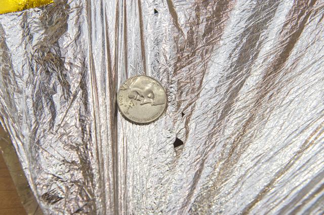 TIFFANY LOCKETT OVERSEES THE HALF SCALE (36 SQUARE METERS) ENGINEERING DEVELOPMENT UNIT (EDU) SOLAR SAIL DEPLOYMENT DEMONSTRATION IN PREPARATION FOR FULL SCALE EDU (86 SQUARE METERS) DEPLOYMENT IN APRIL, 2016. DETAILS OF RIPS AND HOLES IN SOLAR SAIL FABRIC.