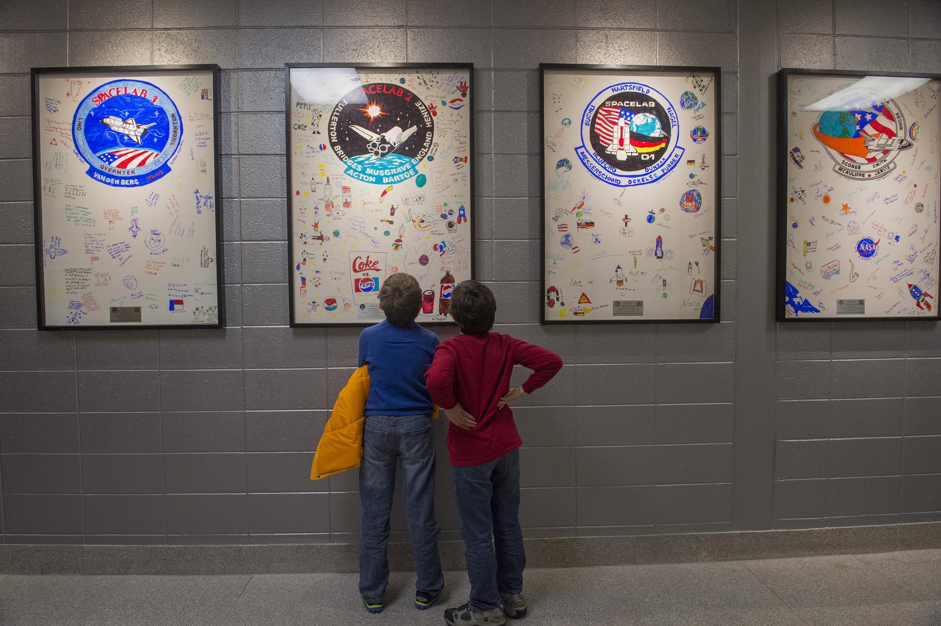 TWO STUDENTS VIEW WHITE BOARDS CREATED BY STUDENTS OF CHALLENGER ELEMENTARY AND MIDDLE SCHOOLS COMMEMORATING THE 19 MISSIONS OF SHUTTLE CHALLENGER