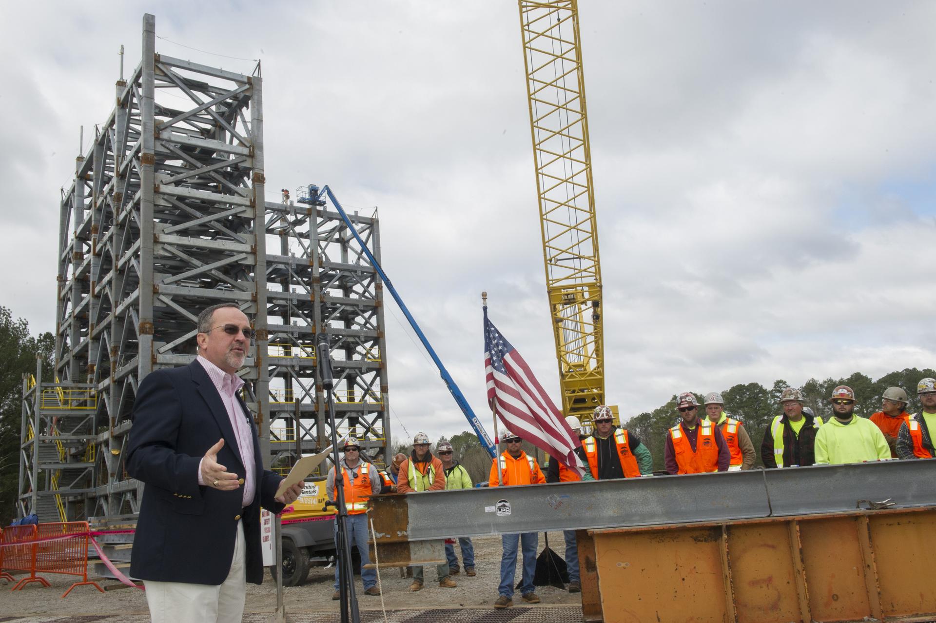 "YOUR WORK IS CRITICAL TO THE JOURNEY TO MARS," SAID SLS DEPUTY PROGRAM MANAGER JERRY COOK TO THE CONSTRUCTION CREW AT THE "TOP OUT" CEREMONY FOR TEST STAND 4697 AT MARSHALL.
