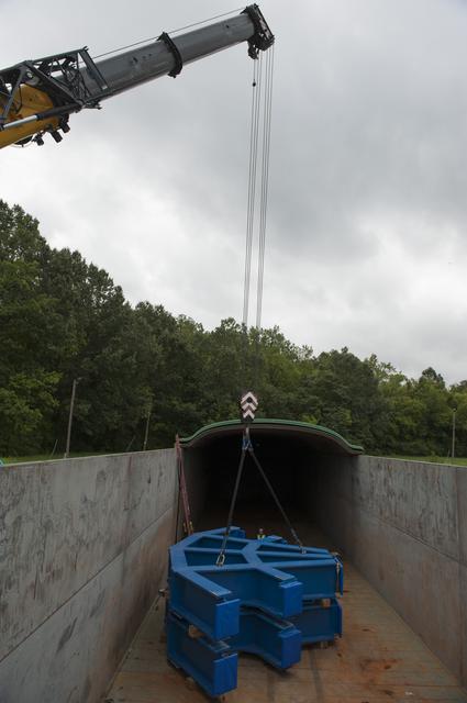 SLS ENGINE SECTION PEDESTALS AND THE ENGINE SECTION SPIDER QUADRANTS ARRIVAL AND UNLOADING AT NASA DOCK ON THE TENNESSEE RIVER.
