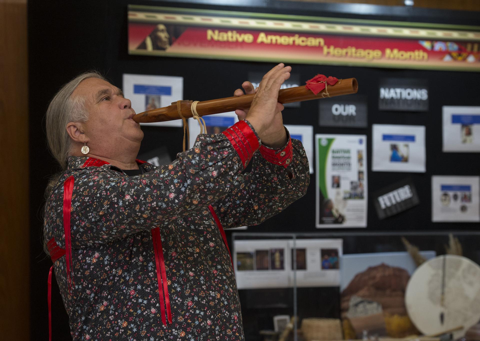 JIMMY YELLOWHORSE, A MEMBER OF THE CHEROKEE TRIBE, PERFORMS A TRADITIONAL SONG DURING THE NATIVE AMERICAN HERITAGE MONTH EVENT AT NASA’S MARSHALL SPACE FLIGHT CENTER NOV. 29.
