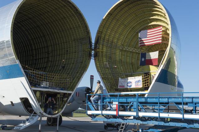 The platform which will be used to load the Orion stage adapter is shown being positioned in front of NASA's Super Guppie. After being tested at Marshall Space Flight Center the stage adapter will be flown to Denver, Colorado for further testing.