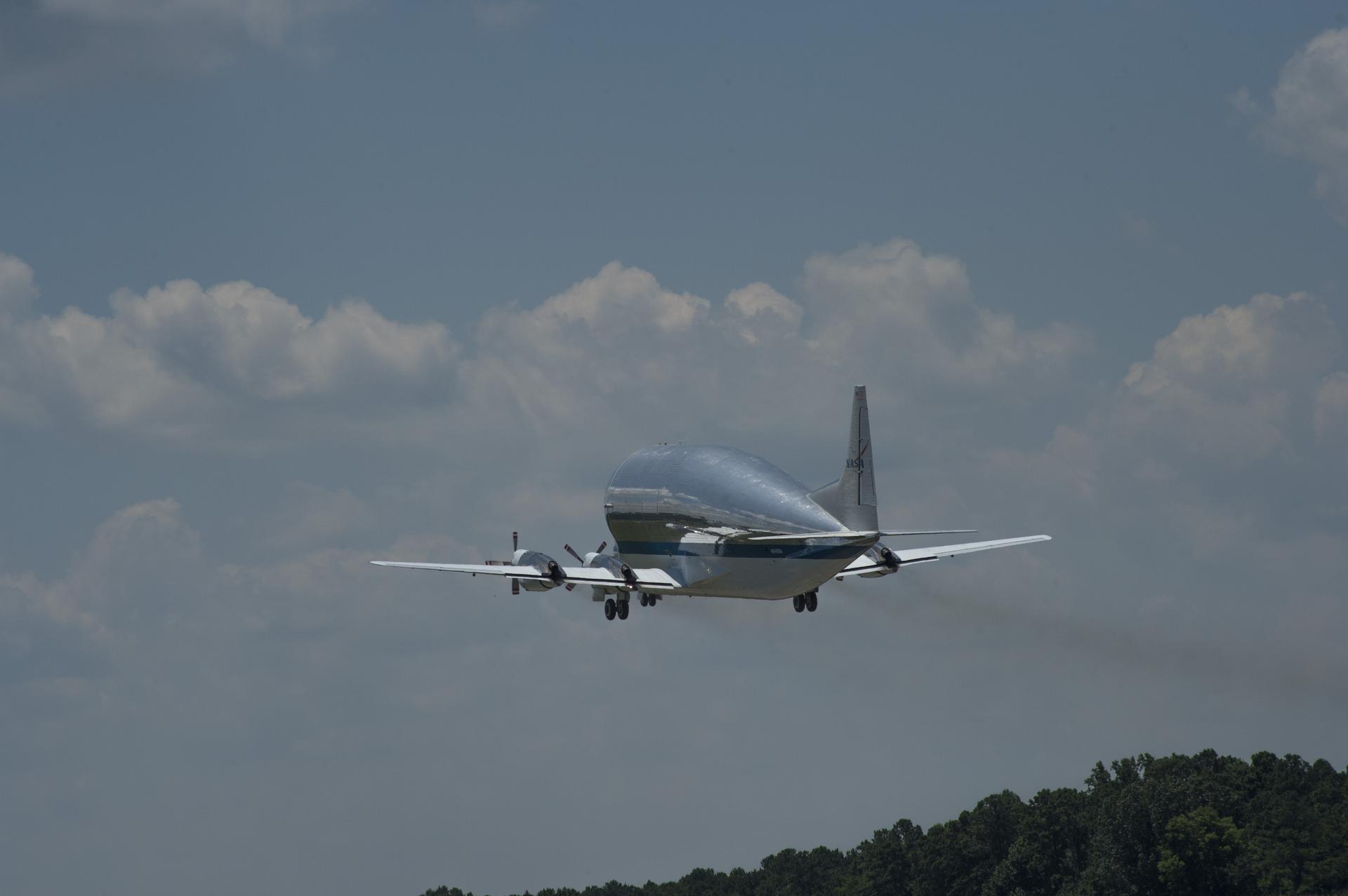 NASA's Super Guppie aircraft lifts off from Redstone Arsenal's airfield with the Orion stage adapter which will be transported to Denver, Colorado for further testing.