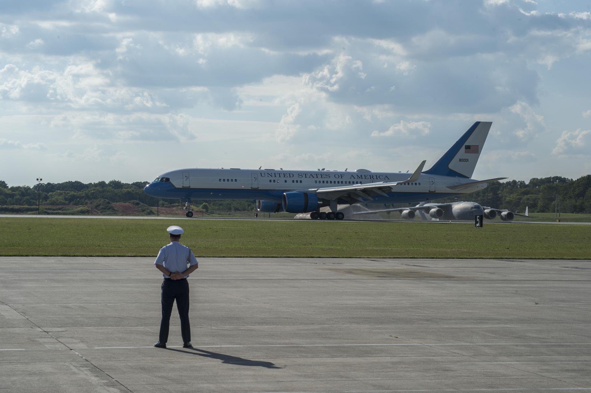 Air Force Two lands with Vice President Mike Pence along with Congressman Robert Aderholt at the Redstone Army Airfield in Huntsville, Alabama, on Monday, Sept. 25. The Vice President is visiting NASA’s Marshall Space Flight Center, located on Redstone Arsenal, to meet with employees, view test hardware for NASA’s Space Launch System — America’s new deep-space rocket, and tour the Payload Operations Integration Center, “science central” for the International Space Station.
