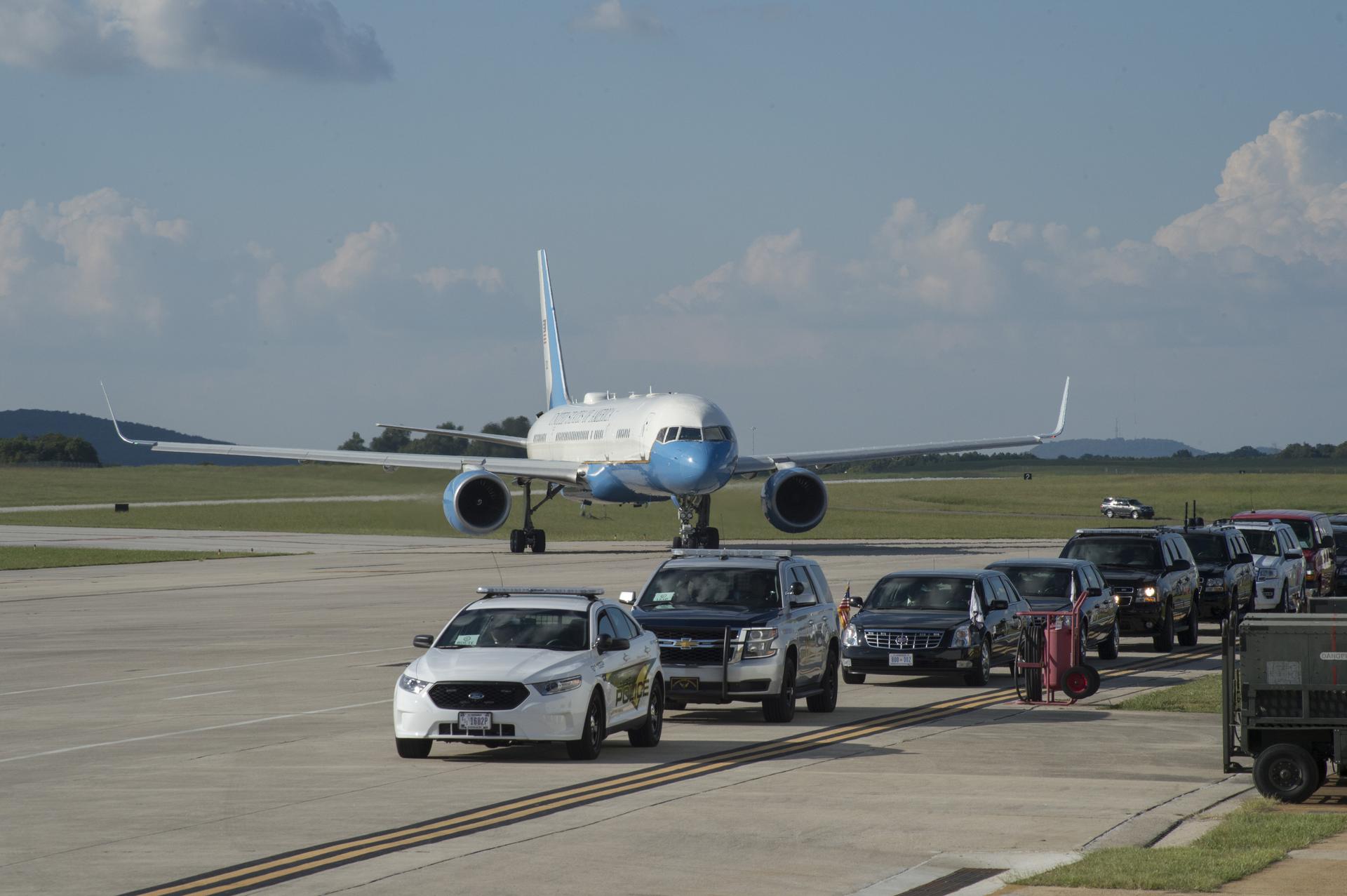 Air Force Two lands with Vice President Mike Pence along with Congressman Robert Aderholt at the Redstone Army Airfield in Huntsville, Alabama, on Monday, Sept. 25. The Vice President is visiting NASA’s Marshall Space Flight Center, located on Redstone Arsenal, to meet with employees, view test hardware for NASA’s Space Launch System — America’s new deep-space rocket, and tour the Payload Operations Integration Center, “science central” for the International Space Station.