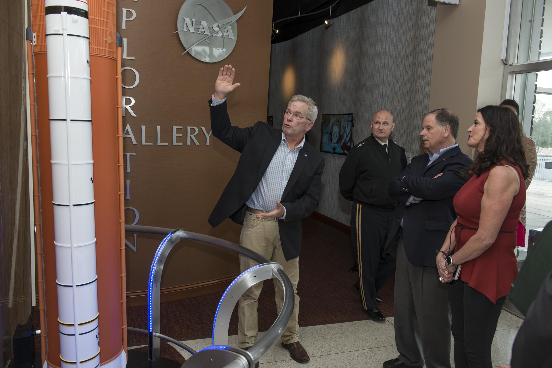 Senator Doug Jones (D-AL.) and wife, Louise, tour Marshall Space Flight facilities. Steve Doering, manager, Stages Element, Space Launch System (SLS) program at MSFC, explains the stages of the SLS rocket with the scale model rocket located in the lobby of building 4200.