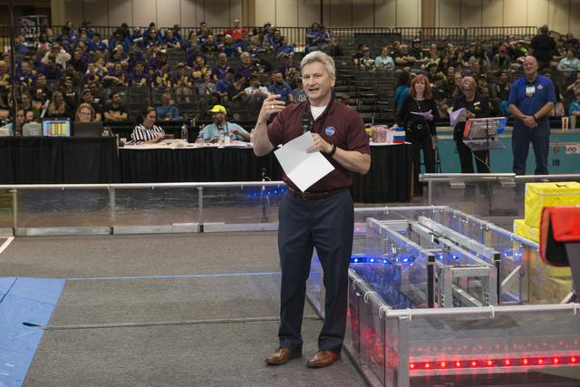 Johnny Stephenson, director of NASA Marshall Space Flight Center's Office of Strategic Analysis & Communications, addresses the crowd during the March 16 award ceremony following the first day of competition at the FIRST Robotics Rocket City Regional at the Von Braun Center in Huntsville. Ed Sparks, of the Morgan County Mech Tech team, received the award for Volunteer of the Year at the March 16 award ceremony. Mech Tech, comprised of students from five high schools in Morgan County, Alabama, also won the Industrial Design Award. The team was one of three regional finalists that will advance to the FIRST national championships April 18-21 in Houston. The other two regional finalists were Burning Magnetos of Fort Dorchester High School in North Charleston, South Carolina, and OGRE of Opelika High School in Opelika, Alabama. Mech Tech and Golden Hurricane from Columbia High School in Huntsville, were "house" teams sponsored by Marshall.