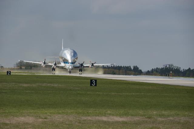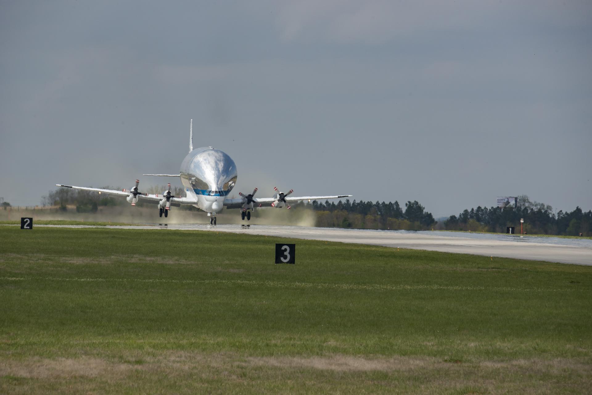 Caption: NASA's Super Guppy aircraft arrives to the U.S. Army’s Redstone Airfield in Huntsville, Alabama, April 2, to pick up flight hardware for NASA’s Space Launch System – its new, deep-space rocket that will enable astronauts to begin their journey to explore destinations far into the solar system. The Guppy will depart on Tuesday, April 3 to deliver the Orion stage adapter to NASA’s Kennedy Space Center in Florida for flight preparations. On Exploration Mission-1, the first integrated flight of the SLS and the Orion spacecraft, the adapter will connect Orion to the rocket and carry 13 CubeSats as secondary payloads.