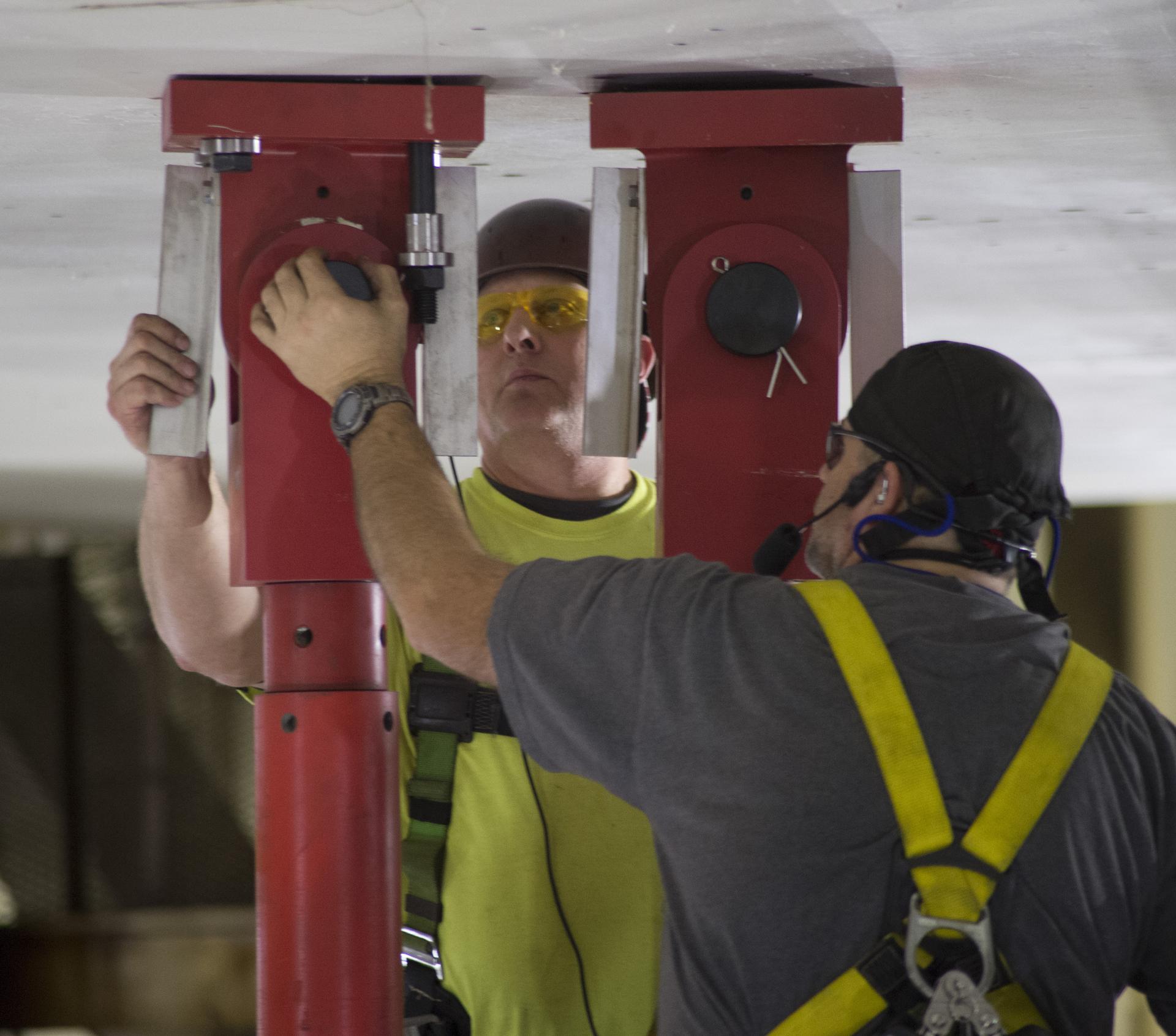 SLS Intertank Test Article, ITA, is attached to crosshead of load test Annex, Bldg. 4619, and removed from bed of KMAG transporter. Rob Ziegler, (L), and Roger Myrick (R), of Aerie Aerospace attach load lines to Aft Load Ring of Intertank Test Article.
