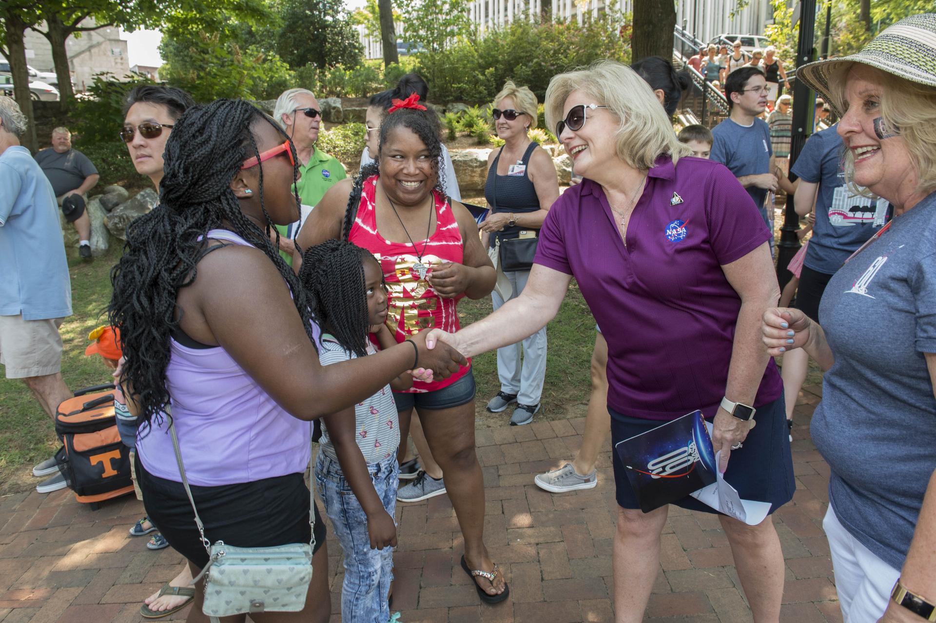 NASA in the Park on June 16 in Huntsville featured more than 60 exhibits and demonstrations by NASA experts, as well as performances by Marshall musicians, educational opportunities, games and hands-on activities for all ages. MSFC Deputy Director Jody Singer welcomes soloist Alyssa Slocum who sang the National Anthem to officially open NASA in the Park activities.