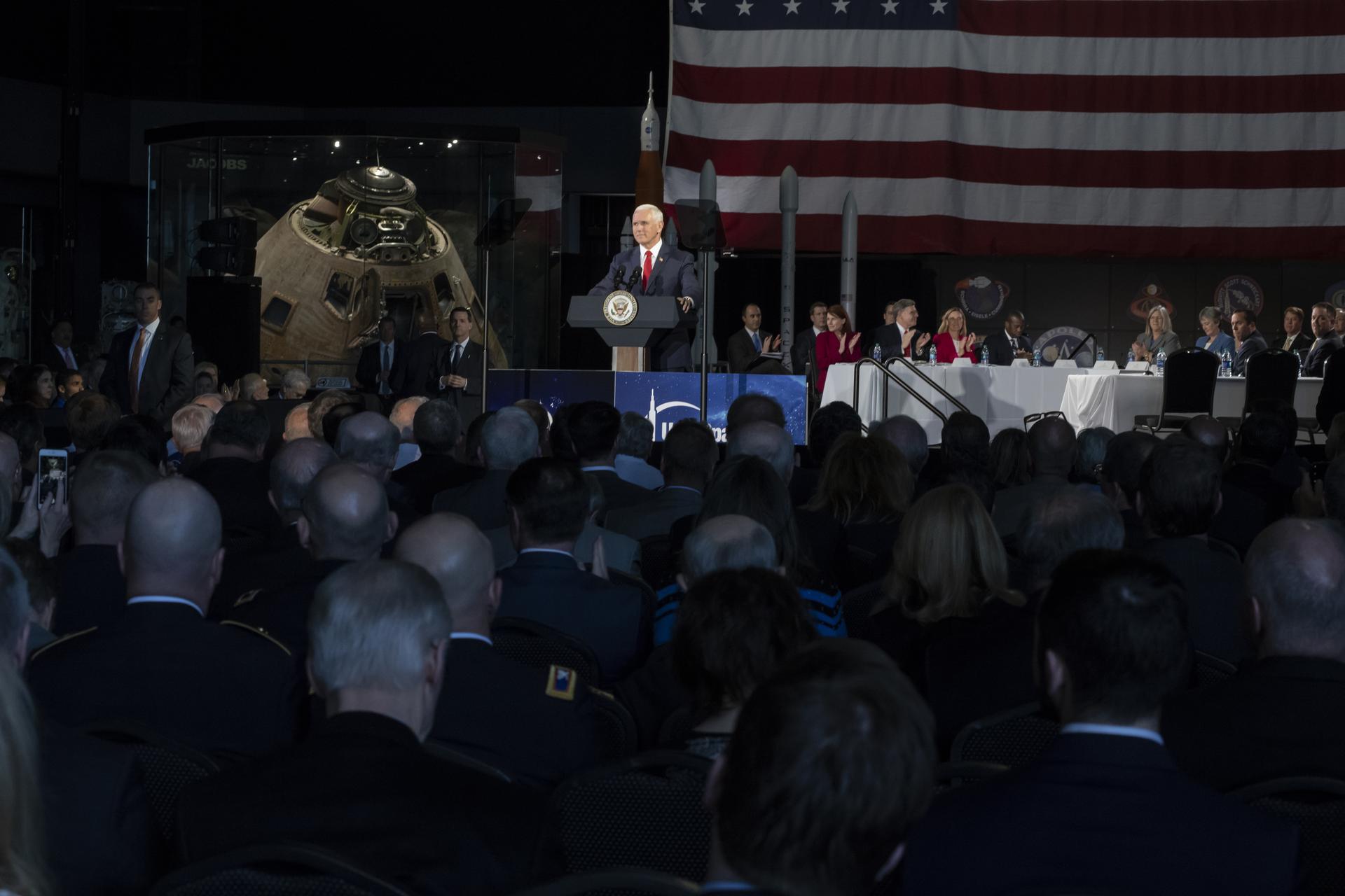 Vice President Mike Pence challenges NASA to put American astronauts on the Moon by 2024. Pence addressed the National Space Council, elected officials, members of the community, NASA Marshall team and area media March 26 at the U.S. Space & Rocket Center in Huntsville.