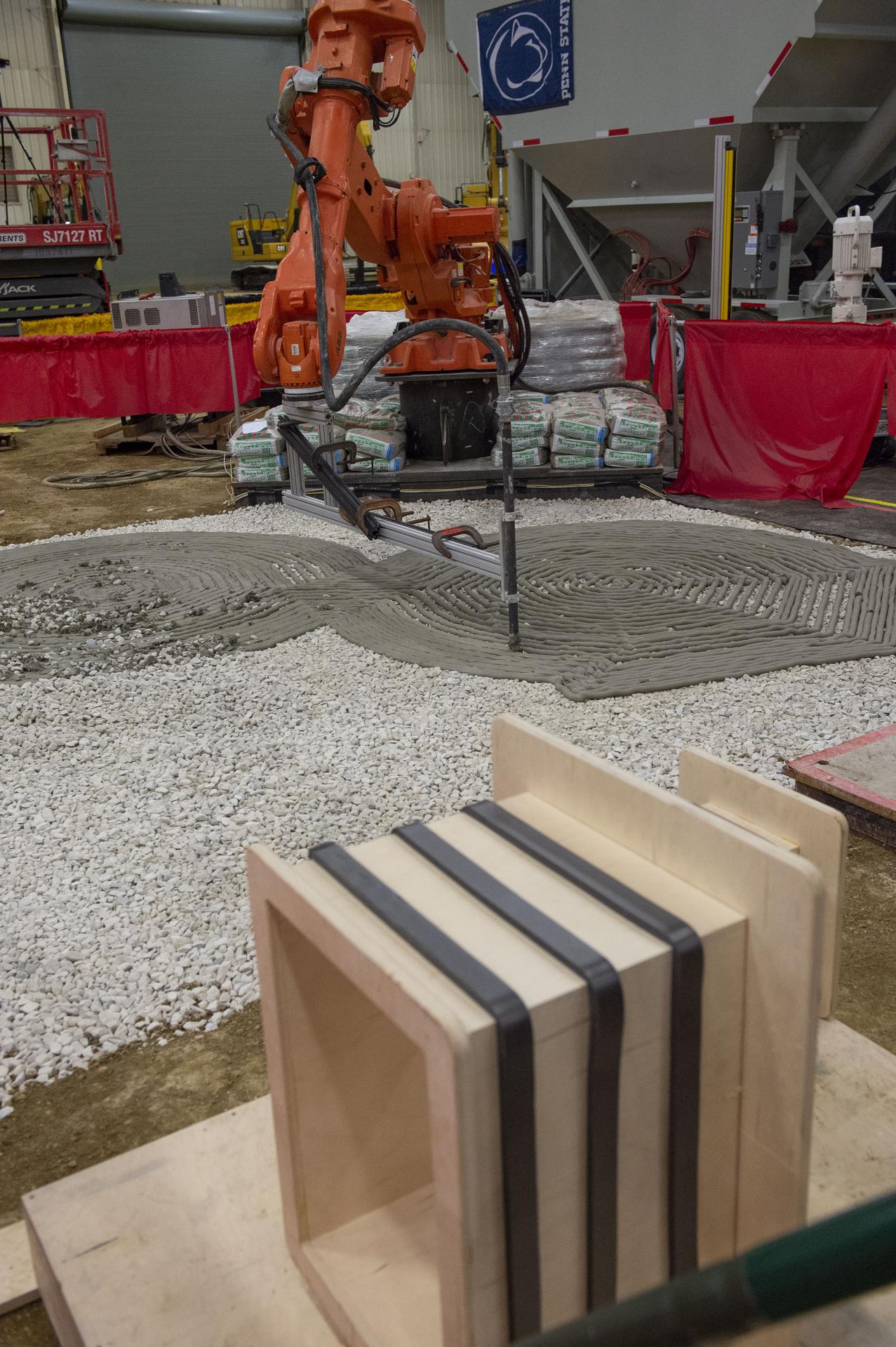 Team Penn State prepares their 3D-printer to begin printing a subscale habitat structure at NASA's 3D-Printed Habitat Challenge, held at the Caterpillar Edwards Demonstration & Learning Center in Edwards, Illinois, May 1-4, 2019. The habitat print is the final level of the multi-phase competition, which began in in 2015. The 3D-Printed Habitat Challenge is a competition to create sustainable shelters suitable for the Moon, Mars or beyond using resources available on-site in these locations. The challenge is managed by NASA's Centennial Challenges program, and partner Bradley University of Peoria, Illinois.