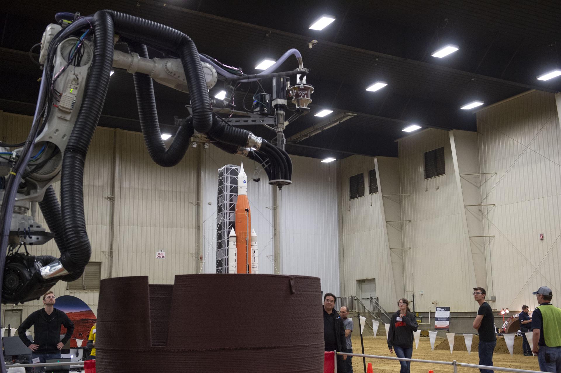 Team AI. SpaceFactory's printer autonomously inserts a window into their 3D-printed subscale habitat structure at NASA's 3D-Printed Habitat Challenge, held at the Caterpillar Edwards Demonstration & Learning Center in Edwards, Illinois, May 1-4, 2019. The habitat print is the final level of the multi-phase competition, which began in in 2015. The 3D-Printed Habitat Challenge is a competition to create sustainable shelters suitable for the Moon, Mars or beyond using resources available on-site in these locations. The challenge is managed by NASA's Centennial Challenges program, and partner Bradley University of Peoria, Illinois.