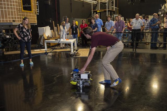 PATHWAYS INTERN ALEXANDRA BOEHM, AND JACOBS INTERN, PEYTON NELSON DEMONSTRATE STEERABLE AIR BEARING TETHER DEPLOYMENT SYSTEM TO MSFC SENIOR MANAGEMENT. ALSO WORKING ON THE PROJECT BUT NOT PICTURED WERE SUMMER INTERN ALI BERTELSMAN, PATHWAYS INTERN ANNA SHIPMAN, AND JACOBS FULL-TIME EMPLOYEE BRANDON MOORE.
