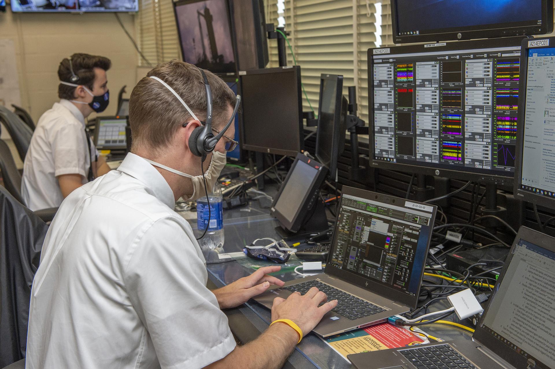 Stewart Whaley, Cameron Muelling, foreground, and teams at NASA’s Marshall Space Flight Center help monitor launch conditions for the Demo-2 mission from the Huntsville Operations Support Center, HOSC.