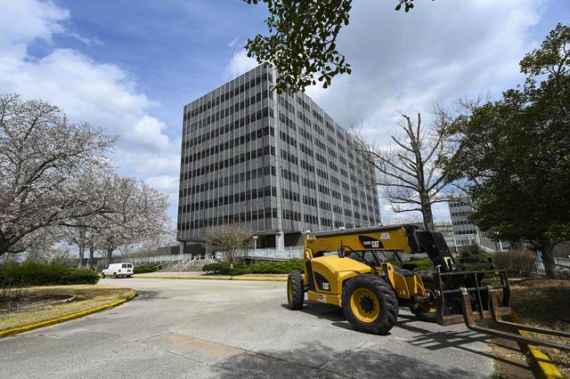 Building 4200 of Marshall’s administrative complex is prepared for demolition in the fall of 2022. Building 4200 was Marshall’s administrative headquarters from 1963 until 2020. The project will make way for a newer, more energy-efficient facilities, providing worksites for new generations of engineers, scientists, and support teams.