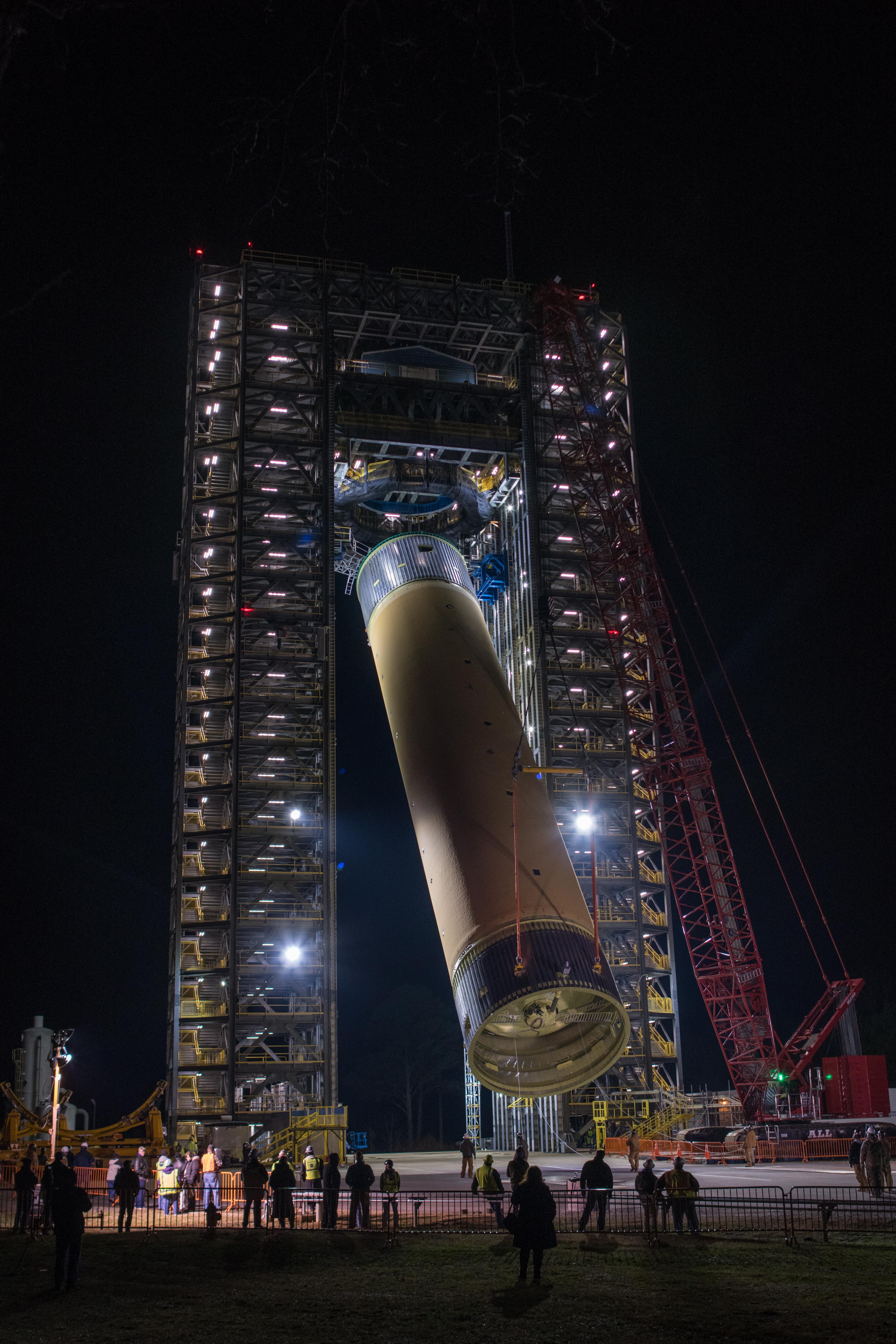 The Space Launch System (SLS) liquid hydrogen tank structural test article is loaded into Test Stand 4693 at NASA’s Marshall Space Flight Center in Huntsville, Alabama, on Jan. 14, 2019. The 149-foot piece of test hardware is the largest piece of structural hardware for the SLS core stage for America’s new deep space rocket Itis structurally identical to the flight version of the tank. It will undergo a series of tests in Test Stand 4693 to simulate the stresses and loads of liftoff and flight. These tests will help ensure designs are adequate for successful SLS missions to the Moon and beyond.