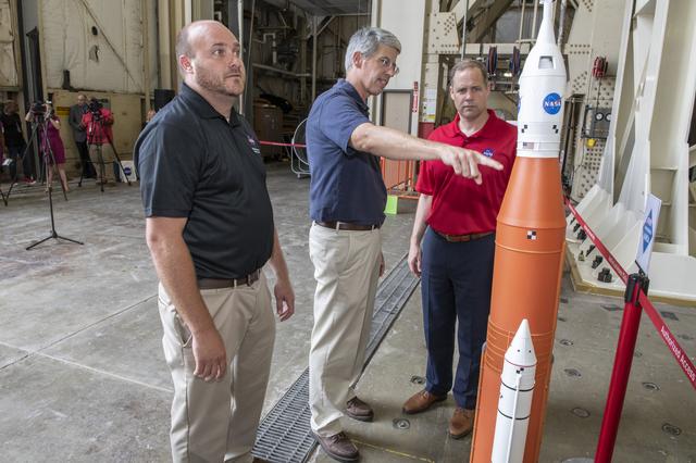 On August 15, 2018 NASA Administrator Jim Bridenstine visited Marshall Space Flight Center. Upon his arrival he was greeted by MSFC Acting Director Jody Singer along with the senior management team. Lead test engineer for the Space Launch System core stage intertank, Matt Cash briefs NASA Administrator Jim Bridenstine on testing progress of the SLS test article in the Structural Strength Lab at Marshall. The test article is structurally identical to the flight version of the intertank that will connect the core stage's two colossal fuel tanks, serve as the upper-connection point for the two solid rocket boosters and house critical avionics and electronics.