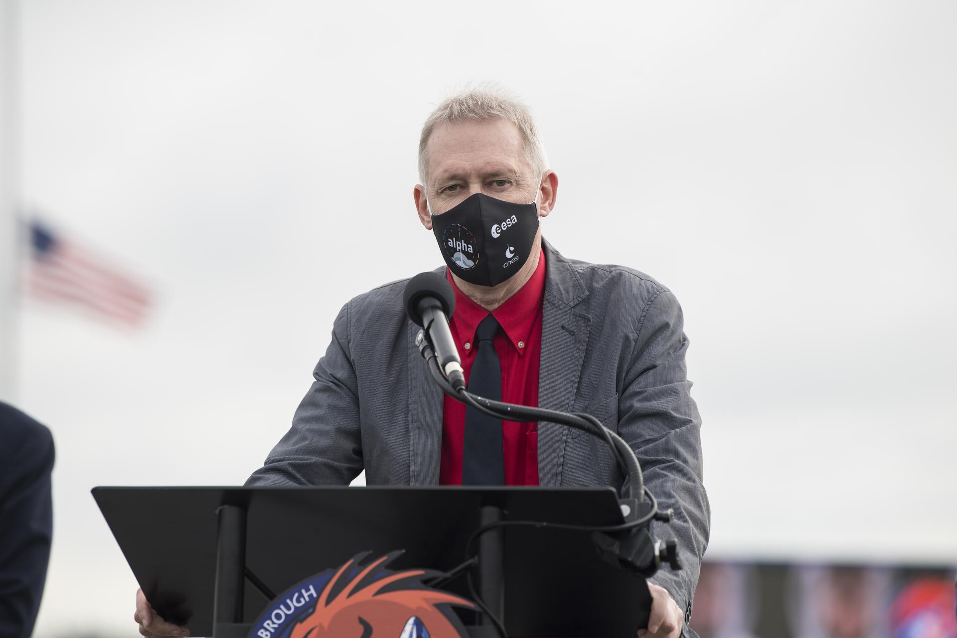 Frank De Winne, manager, International Space Station Program, ESA (European Space Agency), speaks to members of the media during a press conference ahead of the Crew-2 launch, Wednesday, April 21, 2021, at NASA’s Kennedy Space Center in Florida. NASA’s SpaceX Crew-2 mission is the second crew rotation mission of the SpaceX Crew Dragon spacecraft and Falcon 9 rocket to the International Space Station as part of the agency’s Commercial Crew Program. NASA astronauts Shane Kimbrough and Megan McArthur, ESA (European Space Agency) astronaut Thomas Pesquet, and Japan Aerospace Exploration Agency (JAXA) astronaut Akihiko Hoshide are scheduled to launch at 5:49 a.m. EDT on Friday, April 23, from Launch Complex 39A at the Kennedy Space Center. Photo Credit: (NASA/Aubrey Gemignani)