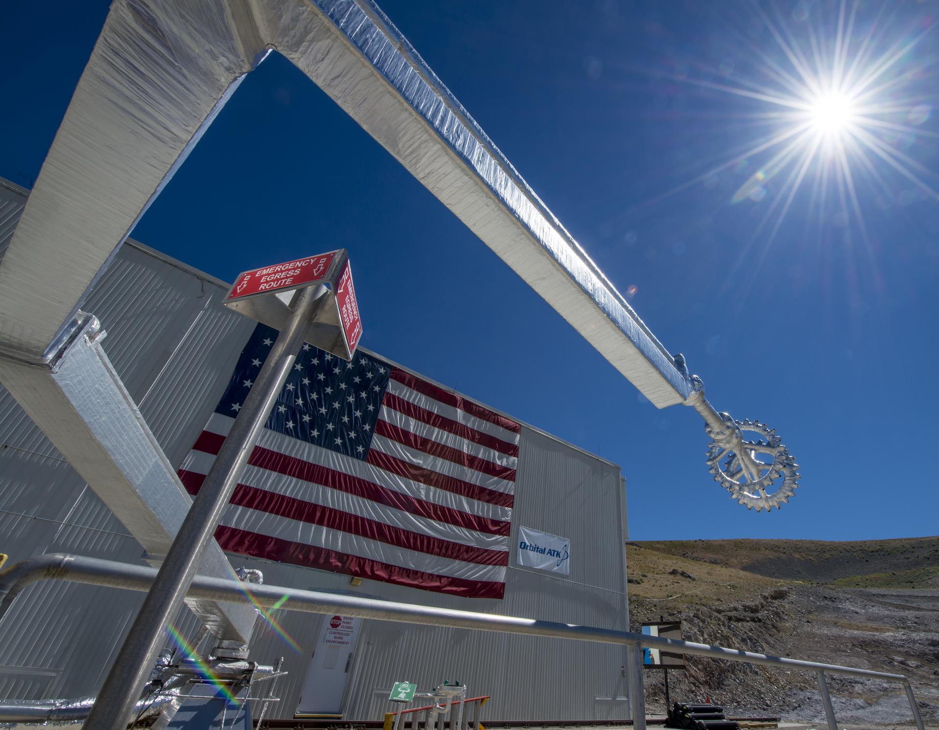 The quench system arm and nozzle are seen at the test area where the second and final qualification motor (QM-2) test for the Space Launch System’s booster will take place, Sunday, June 26, 2016, at Orbital ATK Propulsion Systems test facilities in Promontory, Utah. The test is scheduled for Tuesday, June 28 at 10:05 a.m. EDT (8:05 a.m. MDT). Photo Credit: (NASA/Bill Ingalls)