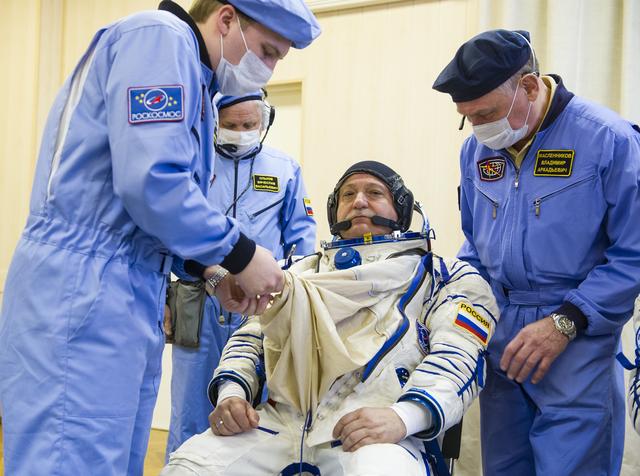 Expedition 51 Soyuz Commander Fyodor Yurchikhin of Roscosmos is helped into his Russian Sokol suit as he and fellow crewmate, Flight Engineer Jack Fischer of NASA prepare for their Soyuz launch to the International Space Station, on Thursday, April 20, 2017 at the Baikonur Cosmodrome in Kazakhstan. Launch of the Soyuz rocket is scheduled for 1:13 p.m. April 20 Baikonur time, and will carry Yurchikhin and Fischer into orbit to begin their four and a half month mission on the International Space Station. Photo Credit: (GCTC/Andrey Shelepin)