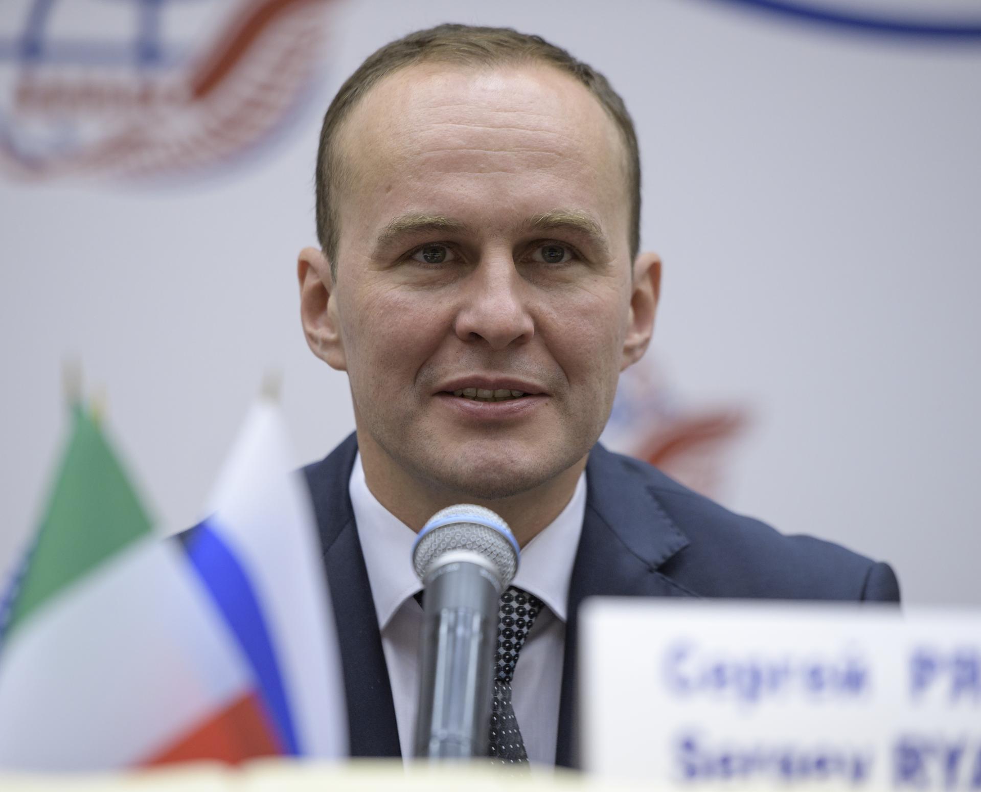 Expedition 52 flight engineer Sergey Ryazanskiy of Roscosmos answers a reporter's question during a crew press conference at the Gagarin Cosmonaut Training Center (GCTC), Monday, July 10, 2017 in Star City, Russia. Photo Credit: (NASA/Bill Ingalls)