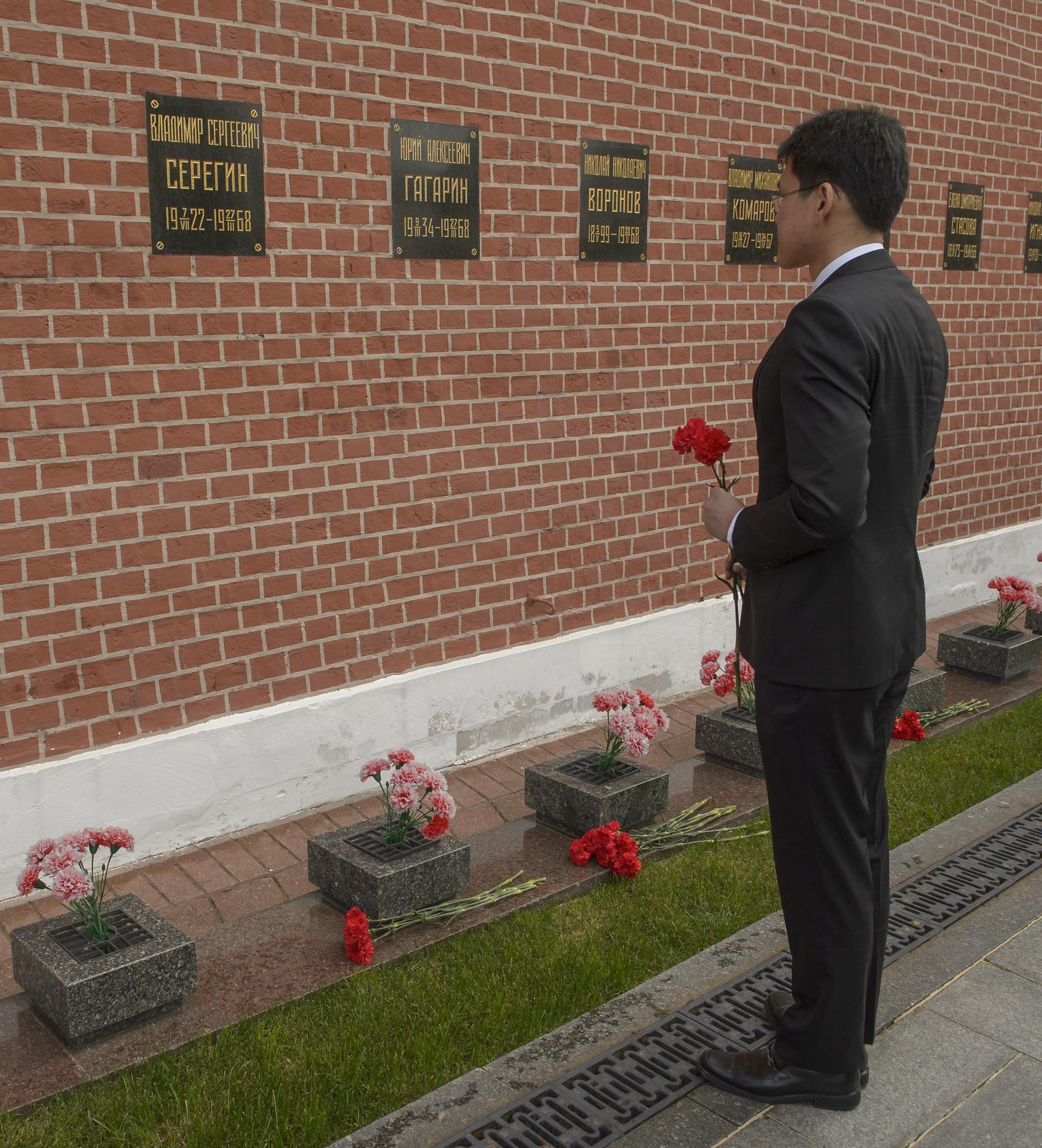 Expedition 52 backup crew member Norishige Kanai of the Japan Aerospace Exploration Agency (JAXA) lays roses at the site where Russian space icons are interred as part of traditional pre-launch ceremonies, Monday, July 10, 2017 in Moscow. Photo Credit: (NASA/Bill Ingalls)