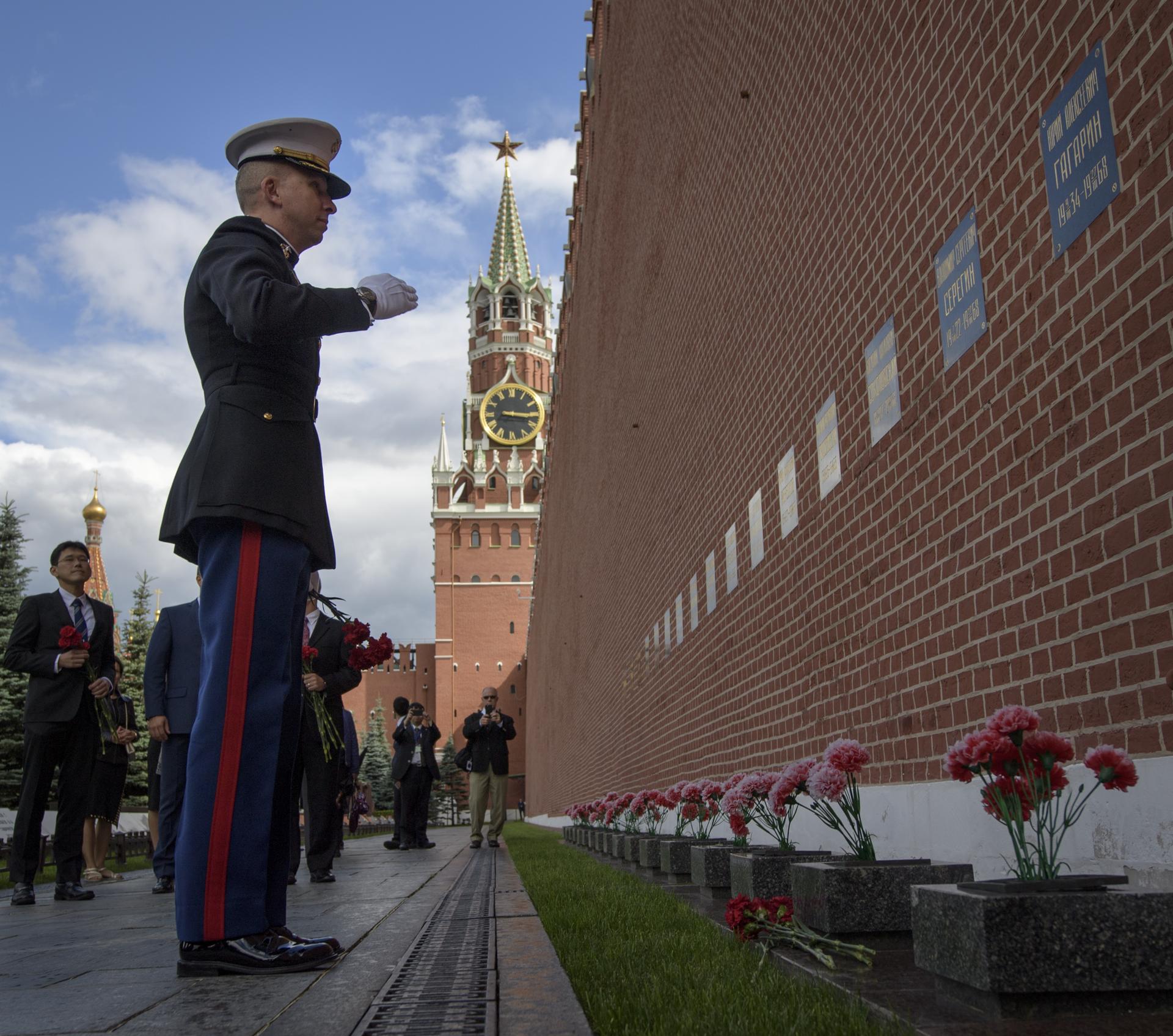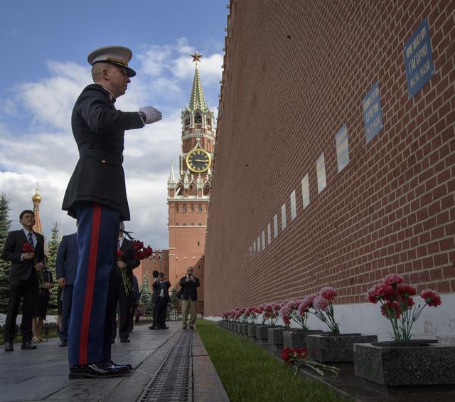 Expedition 52 flight engineer Randy Bresnik of NASA salutes after laying roses at the site where Russian space icons are interred as part of traditional pre-launch ceremonies, Monday, July 10, 2017 in Moscow. Photo Credit: (NASA/Bill Ingalls)