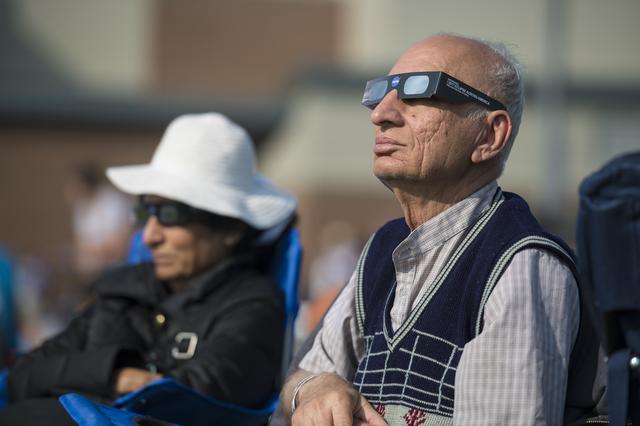 People are seen as they watch a total solar eclipse through protective glasses in Madras, Oregon on Monday, Aug. 21, 2017. A total solar eclipse swept across a narrow portion of the contiguous United States from Lincoln Beach, Oregon to Charleston, South Carolina. A partial solar eclipse was visible across the entire North American continent along with parts of South America, Africa, and Europe. Photo Credit: (NASA/Aubrey Gemignani)