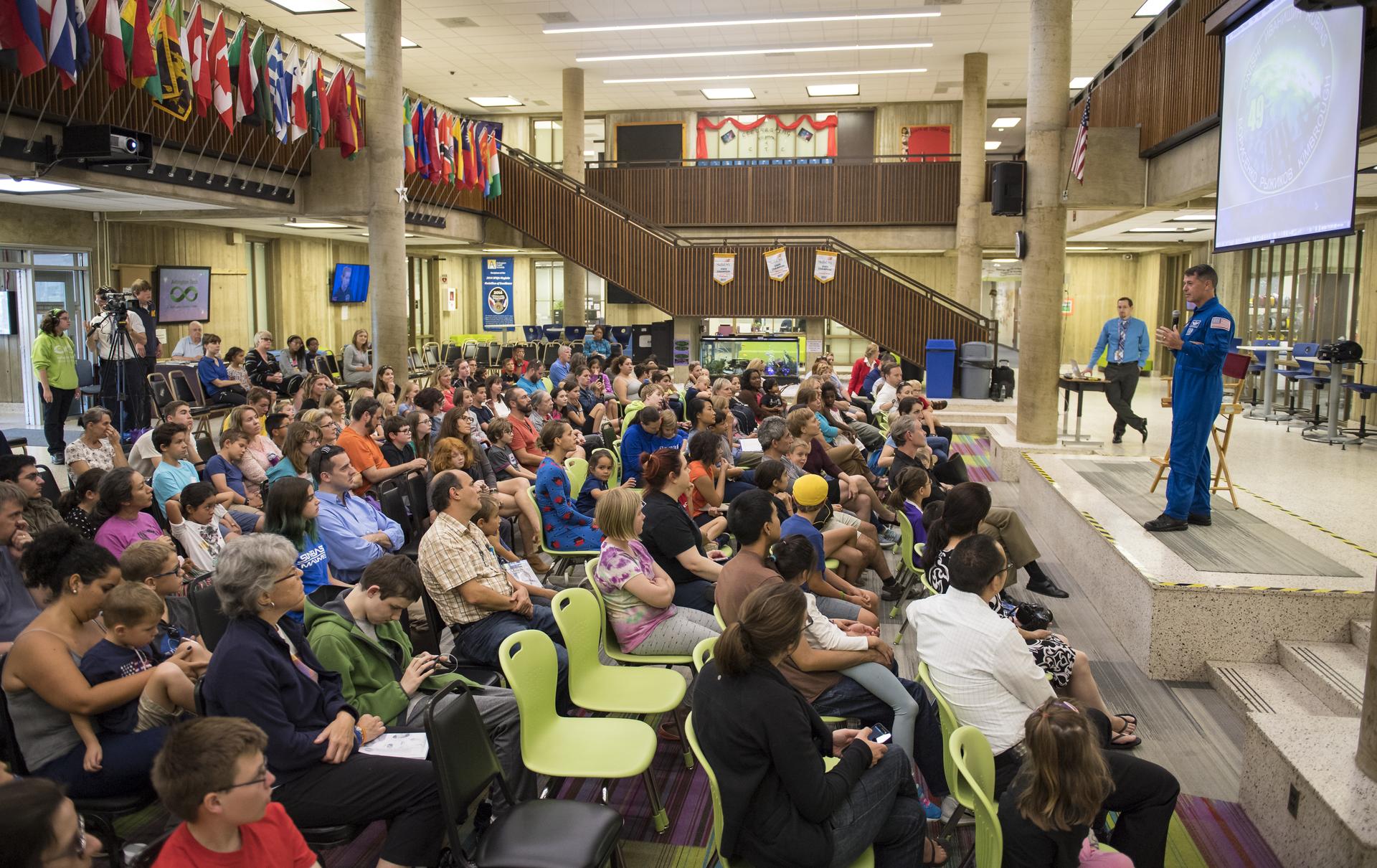 NASA astronaut Shane Kimbrough speaks about his time onboard the International Space Station (ISS) during Expeditions 49/50, Tuesday, September 12, 2017 at Arlington Career Center in Arlington, Virginia. During Expedition 50, Kimbrough completed four spacewalks for a total of 39 hours outside the ISS, and concluded his 173-day mission when he landed in a remote area near the town of Zhezkazgan, Kazakhstan in April 2017. Photo Credit: (NASA/Aubrey Gemignani)