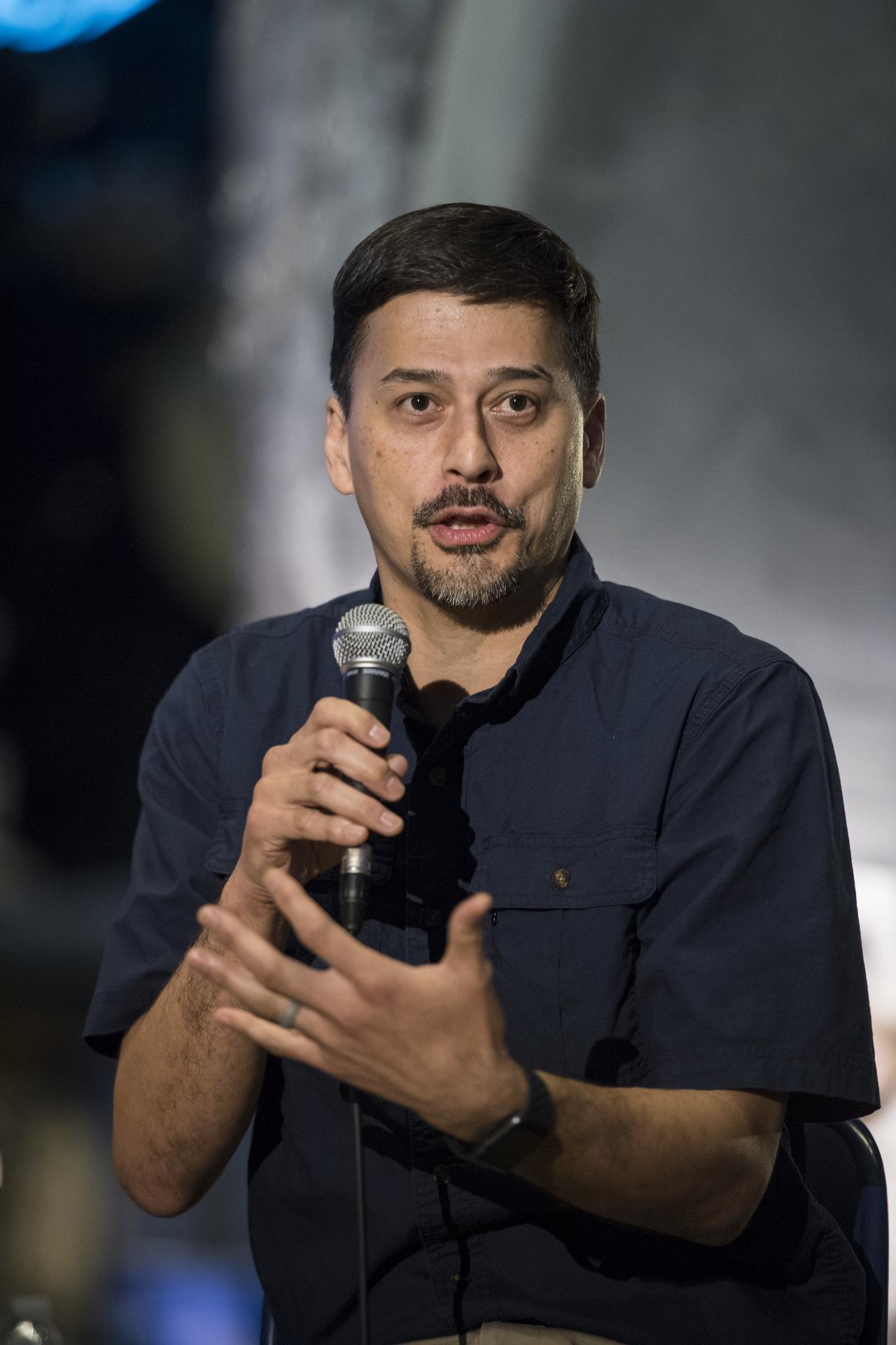 Josh Ajima, instructional facilitator for technology, Loudoun County Public Schools and DesignMakeTeach.com blog, speaks on a panel on "igniting NOVA K-12 engineering and maker education", at a pop-up makerspace hosted by Future Engineers with support from NASA and The American Society of Mechanical Engineers (ASME), at the Steven F. Udvar-Hazy Center, Thursday, September 21, 2017 in Chantilly, Virginia. Participants were able to create digital 3D models using Autodesk Tinkercad and watch objects being printed with Makerbot 3D printers. Photo Credit: (NASA/Aubrey Gemignani)
