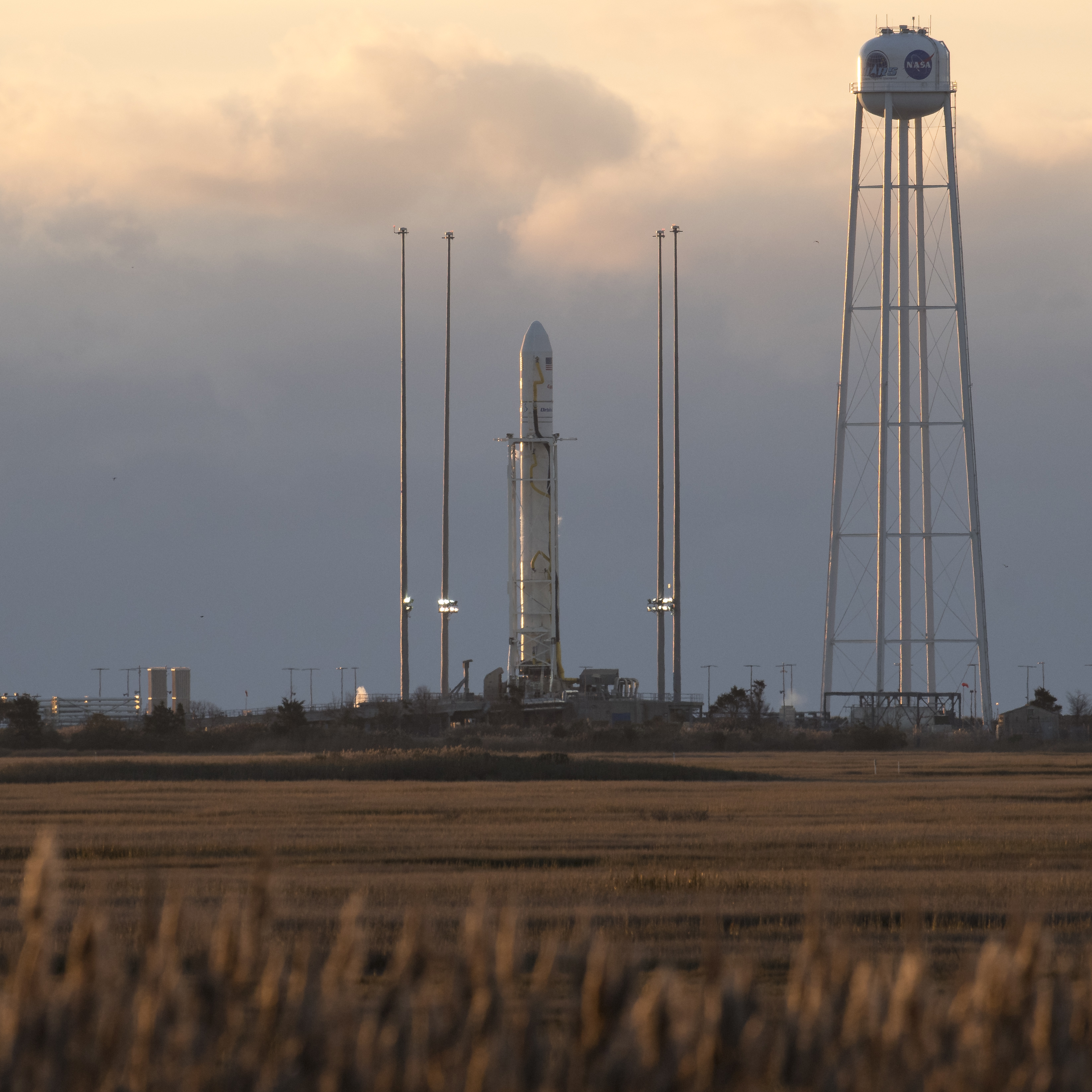 The Orbital ATK Antares rocket, with the Cygnus spacecraft onboard, is seen on launch Pad-0A, Saturday, Nov. 11, 2017 at NASA's Wallops Flight Facility in Virginia. Orbital ATK’s eighth contracted cargo resupply mission with NASA to the International Space Station will deliver approximately 7,400 pounds of science and research, crew supplies and vehicle hardware to the orbital laboratory and its crew. Photo Credit: (NASA/Bill Ingalls)