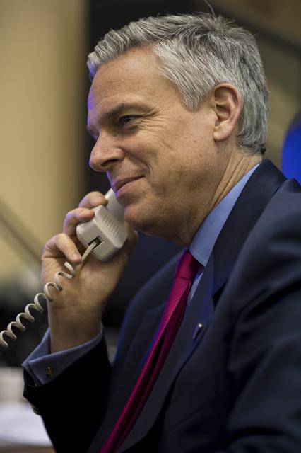 U.S. Ambassador to Russia Jon Huntsman Jr. is seen during an interview with NASA Public Affairs Office Rob Navias in the Moscow Mission Control Center in Korolev, Russia after the Soyuz MS-07 spacecraft docked with the International Space Station, Tuesday, Dec. 19, 2017. Photo Credit: (NASA/Joel Kowsky)