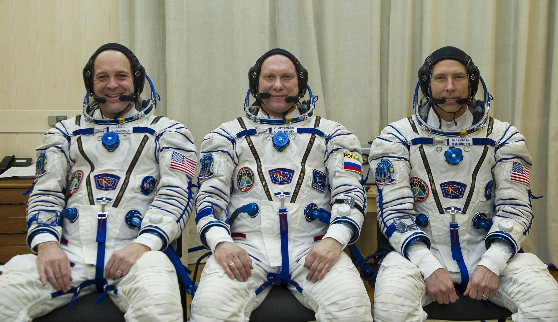 Expedition 55 flight engineer Ricky Arnold of NASA, left, Soyuz Commander Oleg Artemyev of Roscosmos, center, and flight engineer Drew Feustel of NASA, right, pose for a picture after donning their Russian Sokol suits as they prepare for their Soyuz launch to the International Space Station Wednesday, March 21, 2018 in Baikonur, Kazakhstan. Arnold, Artemyev, and Feustel launched aboard the Soyuz MS-08 spacecraft at 1:44 p.m. Eastern time (11:44 p.m. Baikonur time) on March 21 to begin their journey to the International Space Station. Photo Credit: (NASA/GCTC/Irina Peshkova)