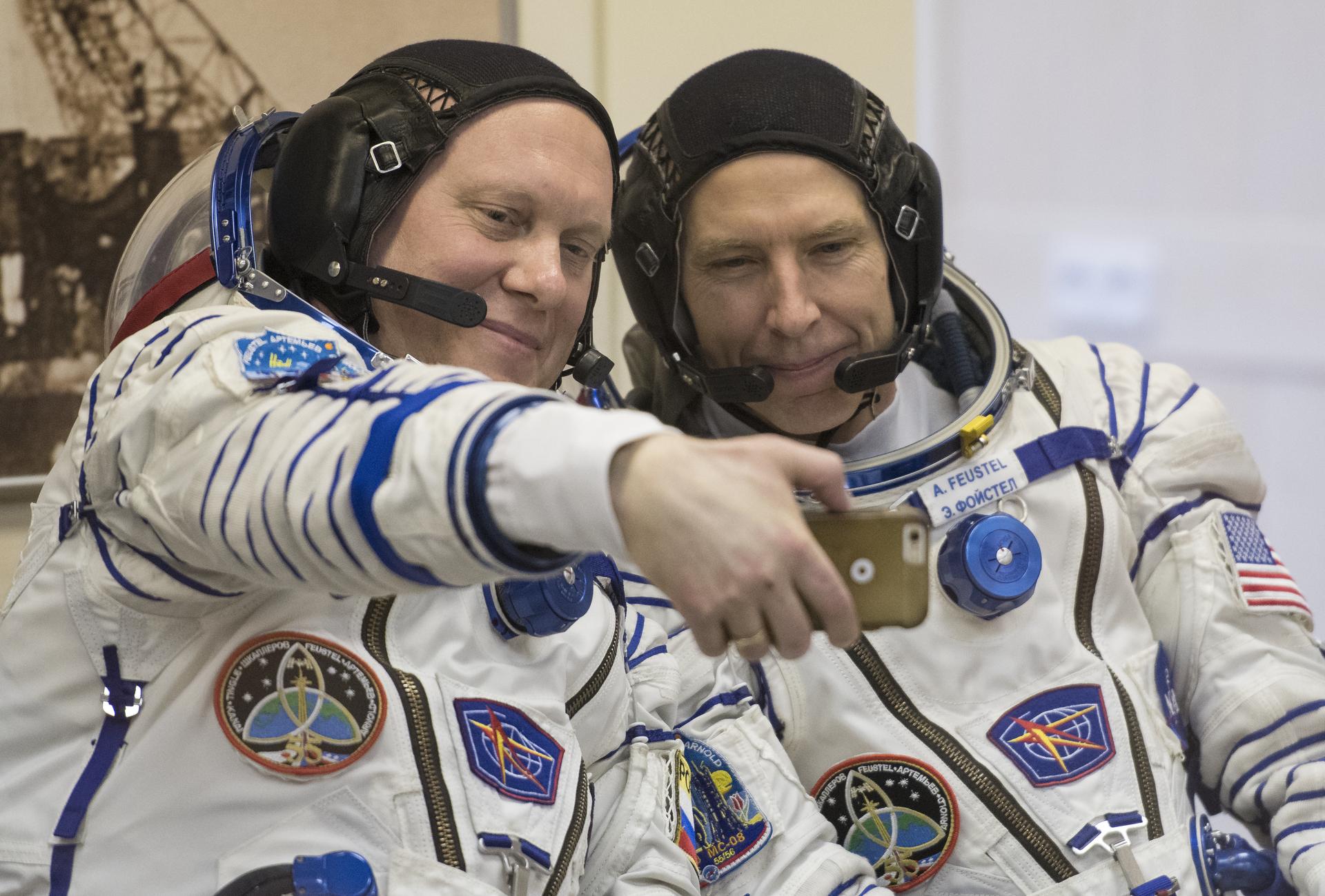 Expedition 55 Soyuz Commander Oleg Artemyev of Roscosmos, left, and flight engineer Drew Feustel of NASA take a selfie after having their Russian Sokol suits pressure checked in preparation for launch aboard the Soyuz MS-08 spacecraft, Wednesday, March 21, 2018 at the Baikonur Cosmodrome in Kazakhstan. Artemyev, Feustel, and flight engineer Ricky Arnold of NASA launched aboard the Soyuz MS-08 spacecraft at 1:44 p.m. Eastern time (11:44 p.m. Baikonur time) on March 21 to begin their journey to the International Space Station. Photo Credit: (NASA/Joel Kowsky)