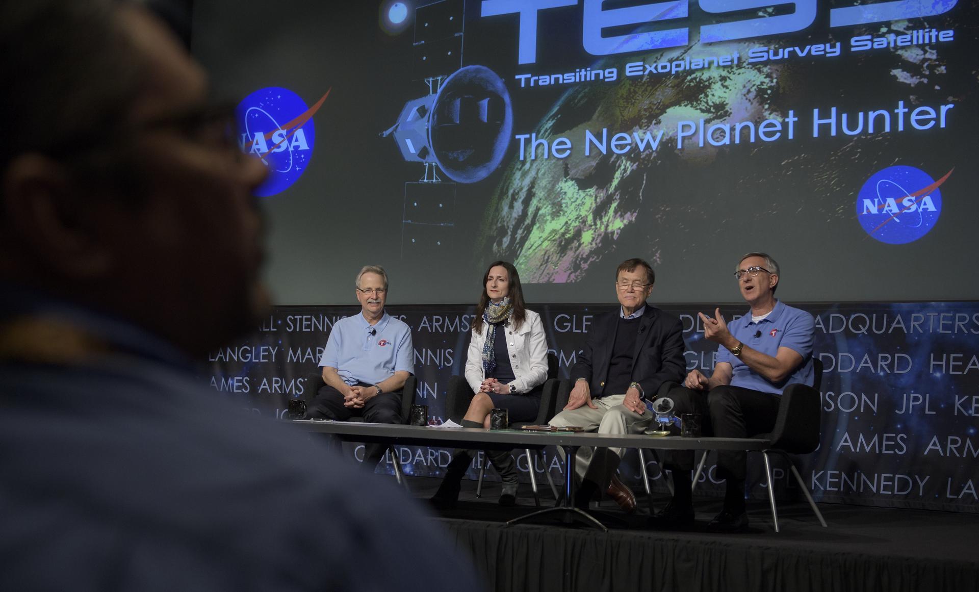 NASA Astrophysics Division director Paul Hertz, left, Sara Seager, TESS deputy director of science, MIT, George Ricker, TESS principal investigator, MIT Kavli Institute for Astrophysics and Space Research, and Jeff Volosin, TESS project manager, NASA’s Goddard Space Flight Center, right, discuss the upcoming launch of NASA’s next planet hunter, the Transiting Exoplanet Survey Satellite (TESS), Wednesday, March 28, 2018 at NASA Headquarters in Washington. Photo Credit: (NASA/Bill Ingalls)