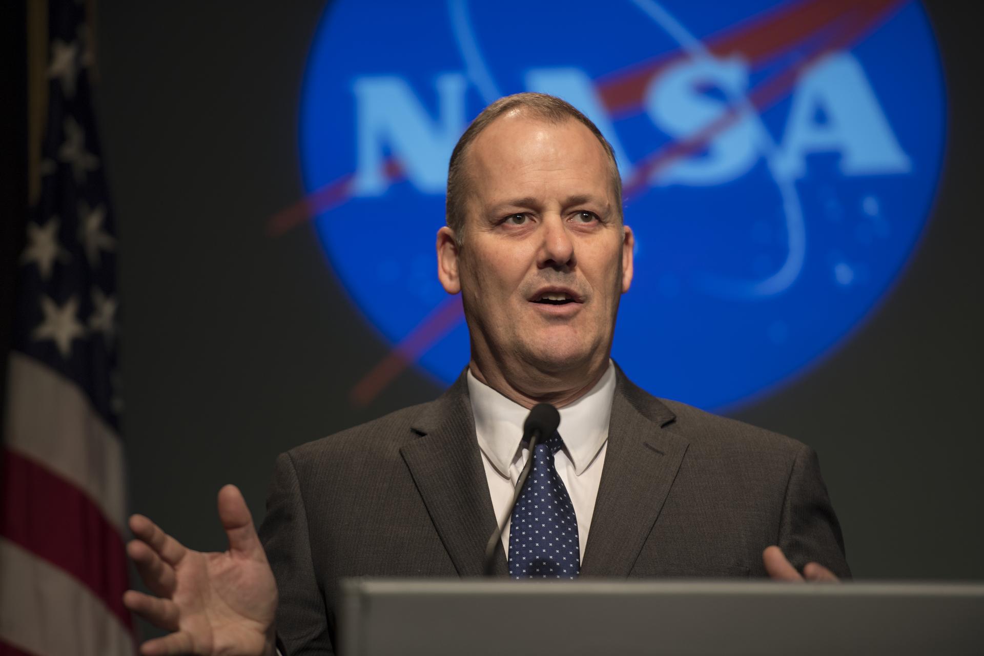 Dave Richardson, director, Air Vehicle Design and Technologies, Lockheed Martin Skunk Works, speaks after the announcement that Lockheed Martin won the contract to develop the first X-plane at a briefing, Tuesday, April 3, 2018 at NASA Headquarters in Washington. This new experimental aircraft will cut cross country travel times in half by flying faster than the speed of sound without creating a sonic boom, enabling travel from New York to Los Angeles in two hours. Photo Credit: (NASA/Aubrey Gemignani)