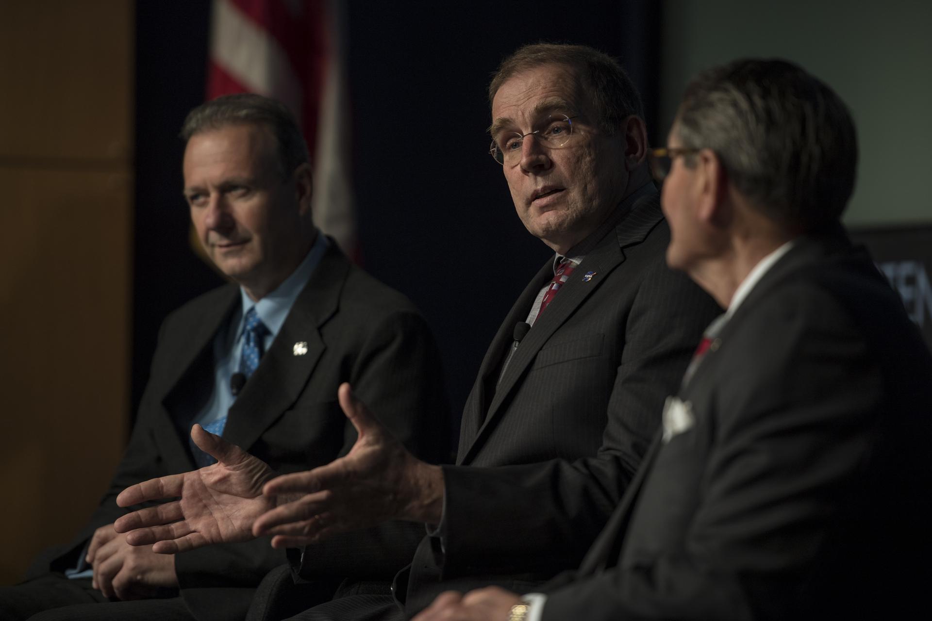 Peter Coen, project manager, Commercial Supersonics Technology Project, Langley Research Center, NASA, speaks on a panel with Peter Iosifidis, Lockheed Martin, left, and Dr. Ed Waggoner, NASA, right, at a briefing on the Low Boom Flight Demonstrator, Tuesday, April 3, 2018 at NASA Headquarters in Washington. This new experimental aircraft will cut cross country travel times in half by flying faster than the speed of sound without creating a sonic boom, enabling travel from New York to Los Angeles in two hours. Photo Credit: (NASA/Aubrey Gemignani)