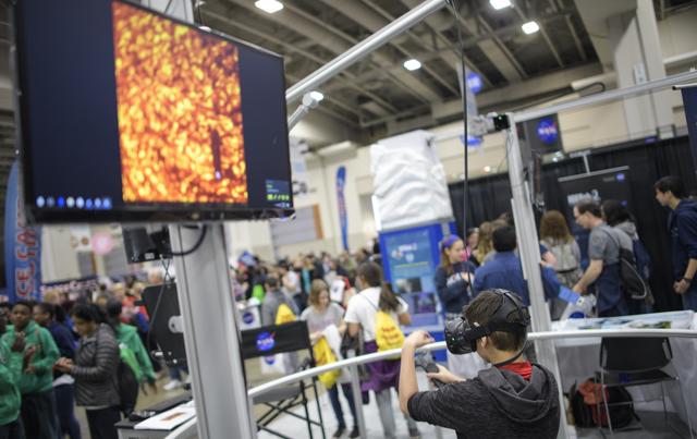 An attendee uses virtual reality goggles to view the Sun during Sneak Peek Friday at the USA Science and Engineering Festival, Friday, April 6, 2018 at the Walter E. Washington Convention Center in Washington, DC. The festival is open to the public April 7-8. Photo Credit: (NASA/Joel Kowsky)
