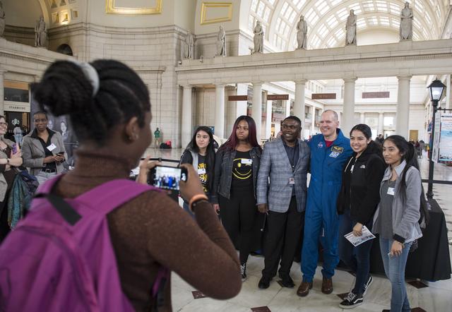 Visitors pose for a photo with former NASA astronaut Paul Richards at the Earth Day event on Thursday, April 19, 2018 at Union Station in Washington, D.C. Photo Credit: (NASA/Aubrey Gemignani)